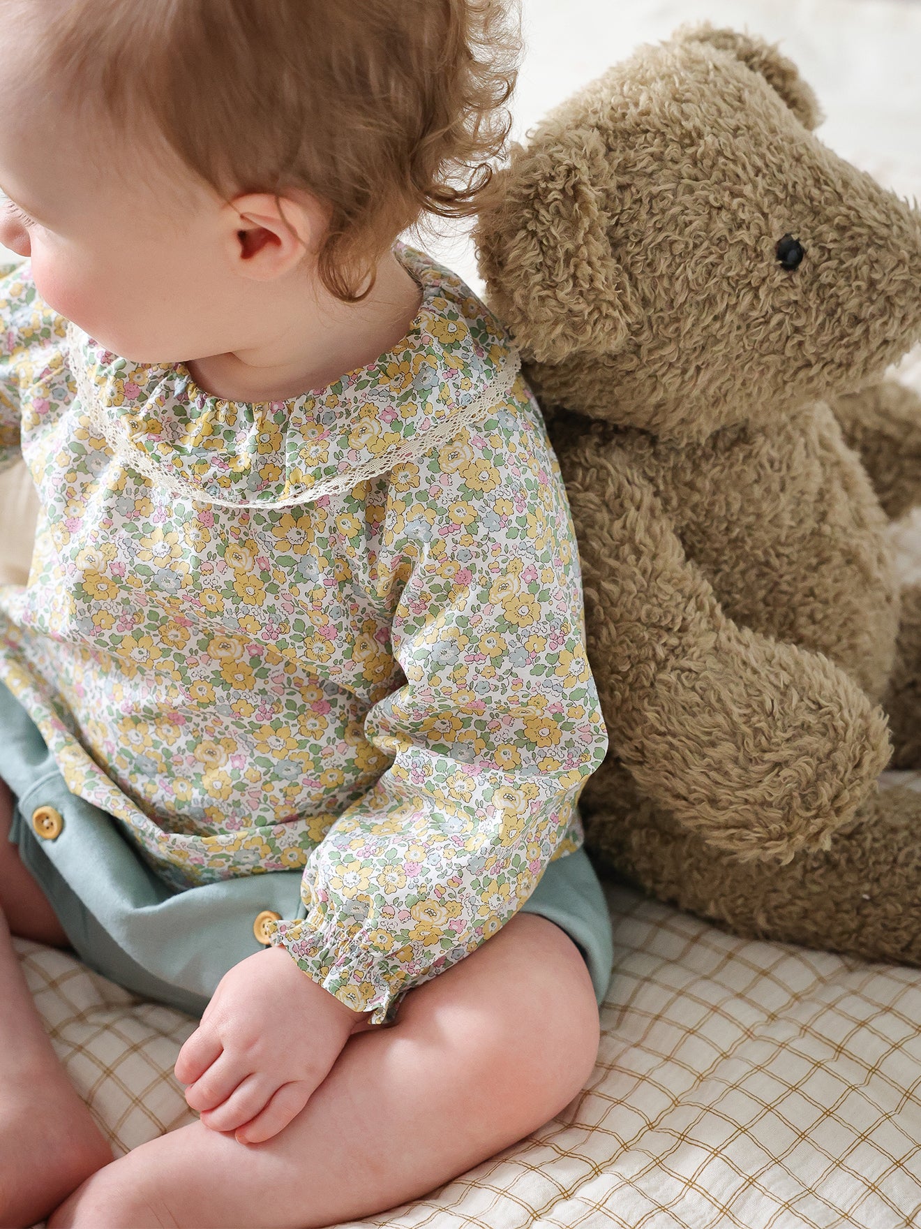 Baby's velour sleepsuit with collar and plush toy with Liberty fabric