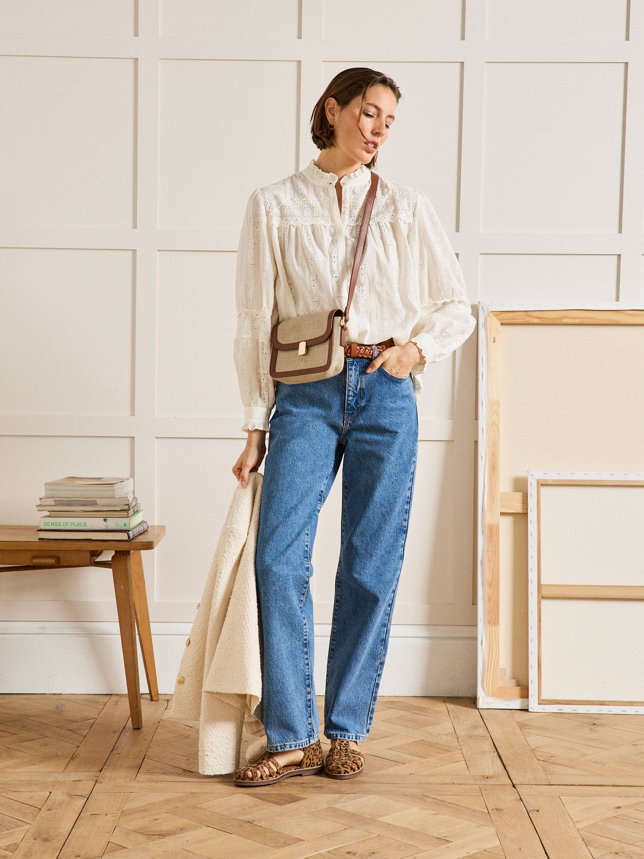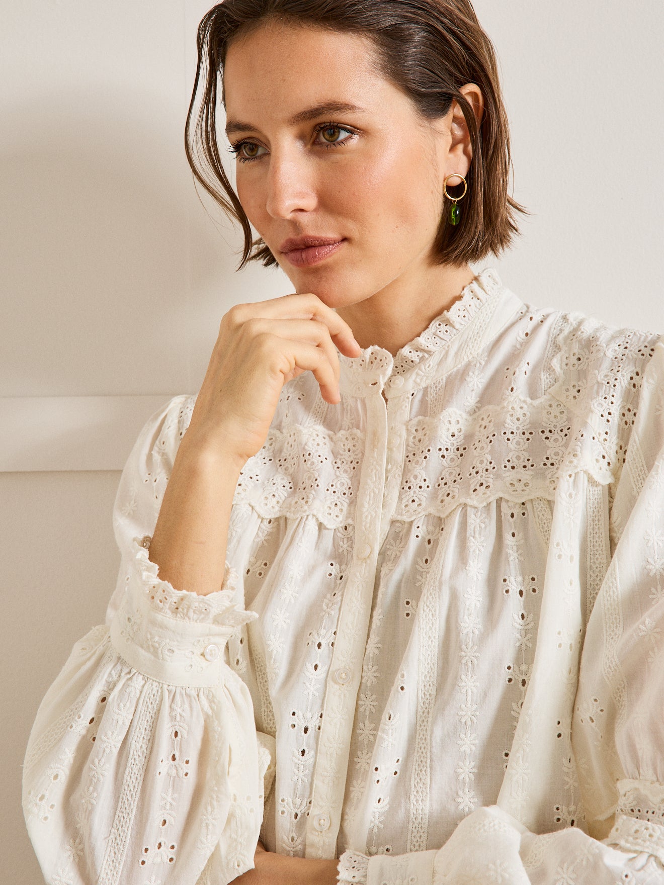 You'll love it for the feminine style it exudes! Embroidery plays with ruffles and gathered details. Heirloom trend and ornate styled blouse that's expertly crafted.