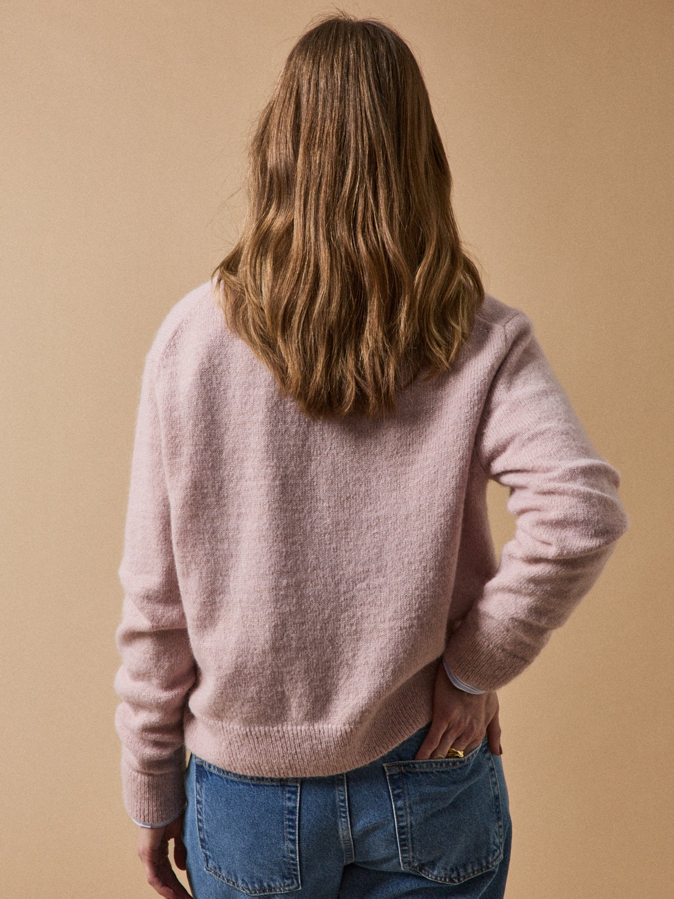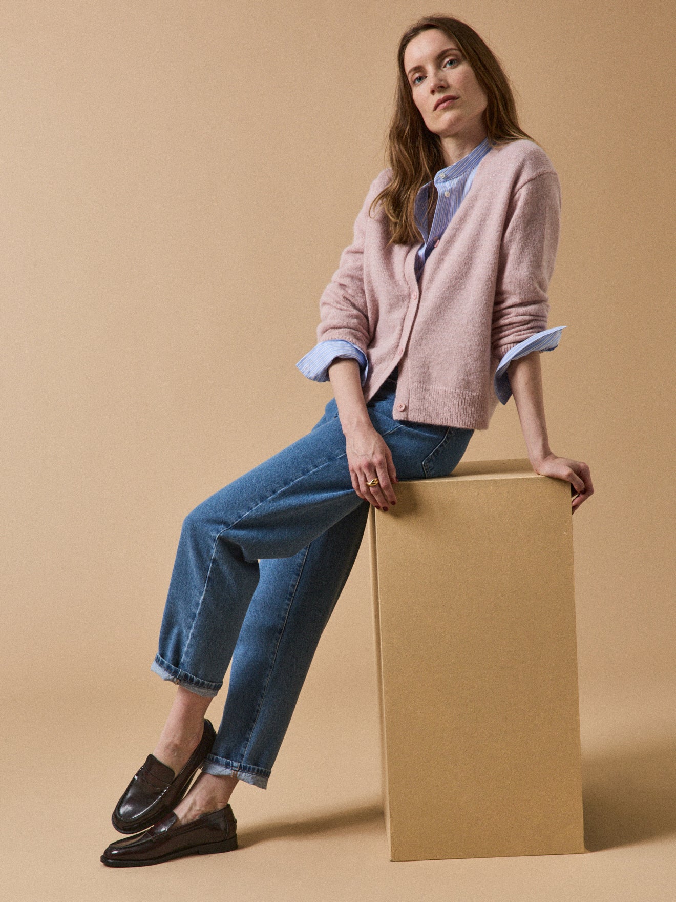 With its soft shades, this iridescent cardigan has a trendy shape and dropped shoulders. A feminine version of the traditional V-neck cardigan.