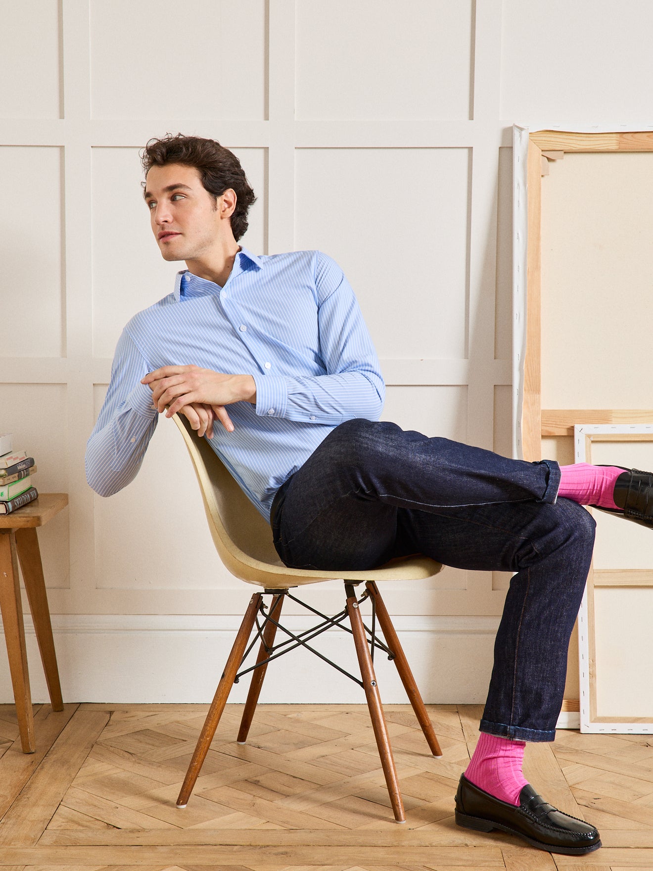 As comfortable below a suit as with chinos, this striped shirt elevates classic and timeless chic style. Fitted to enhance the figure, slightly contoured through the chest and waist.