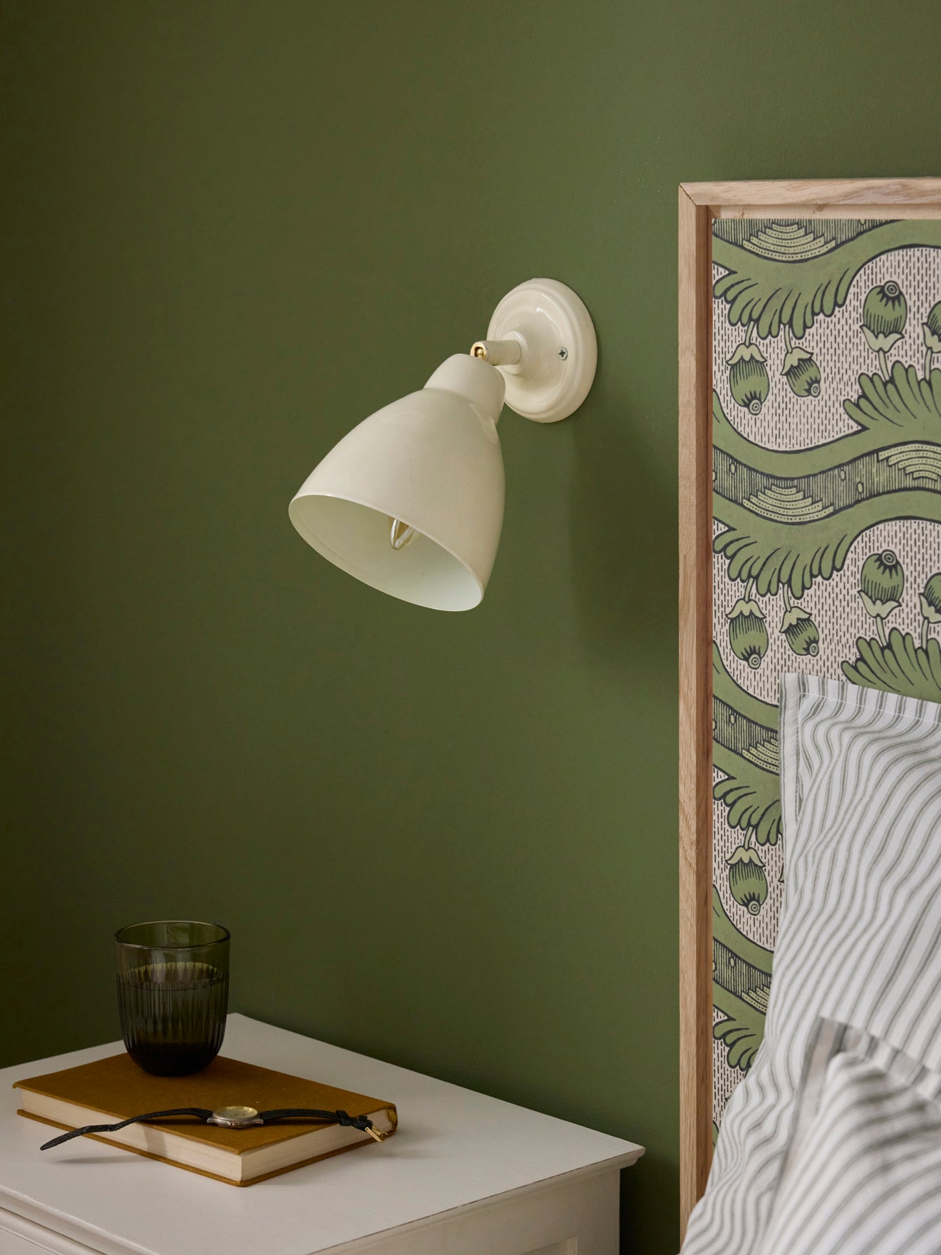 Painted enameled wall lamp. Attaches directly to the wall with neither cable nor plus. The Auguste wall lamp swivels. Produced artisanally in India.