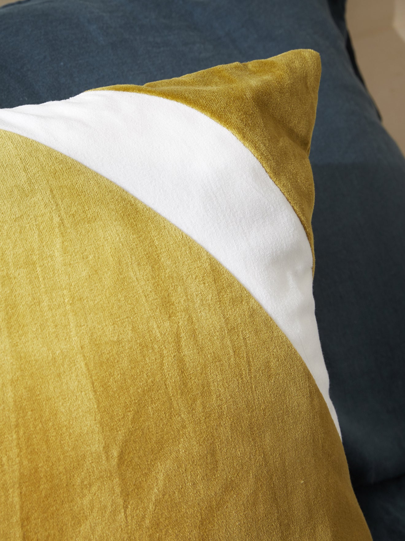 Size, 50 x 40cm approx. Plain velour back (sauge colour for the two-tone cushion cover and greyish ivory for the three-colour cushion cover). Invisible zip fastening. Cushions sold separately at cyrillus.com