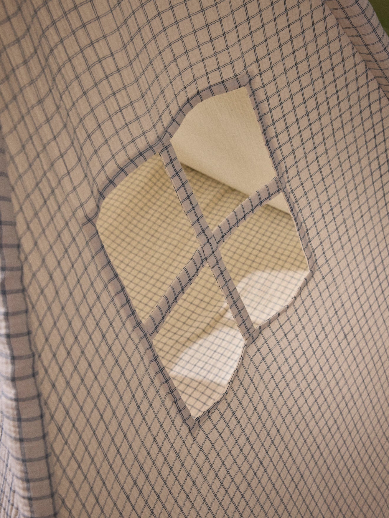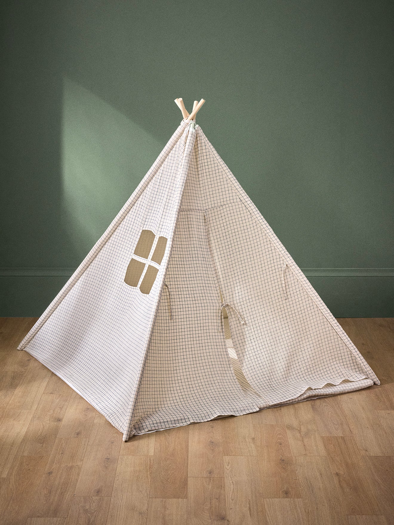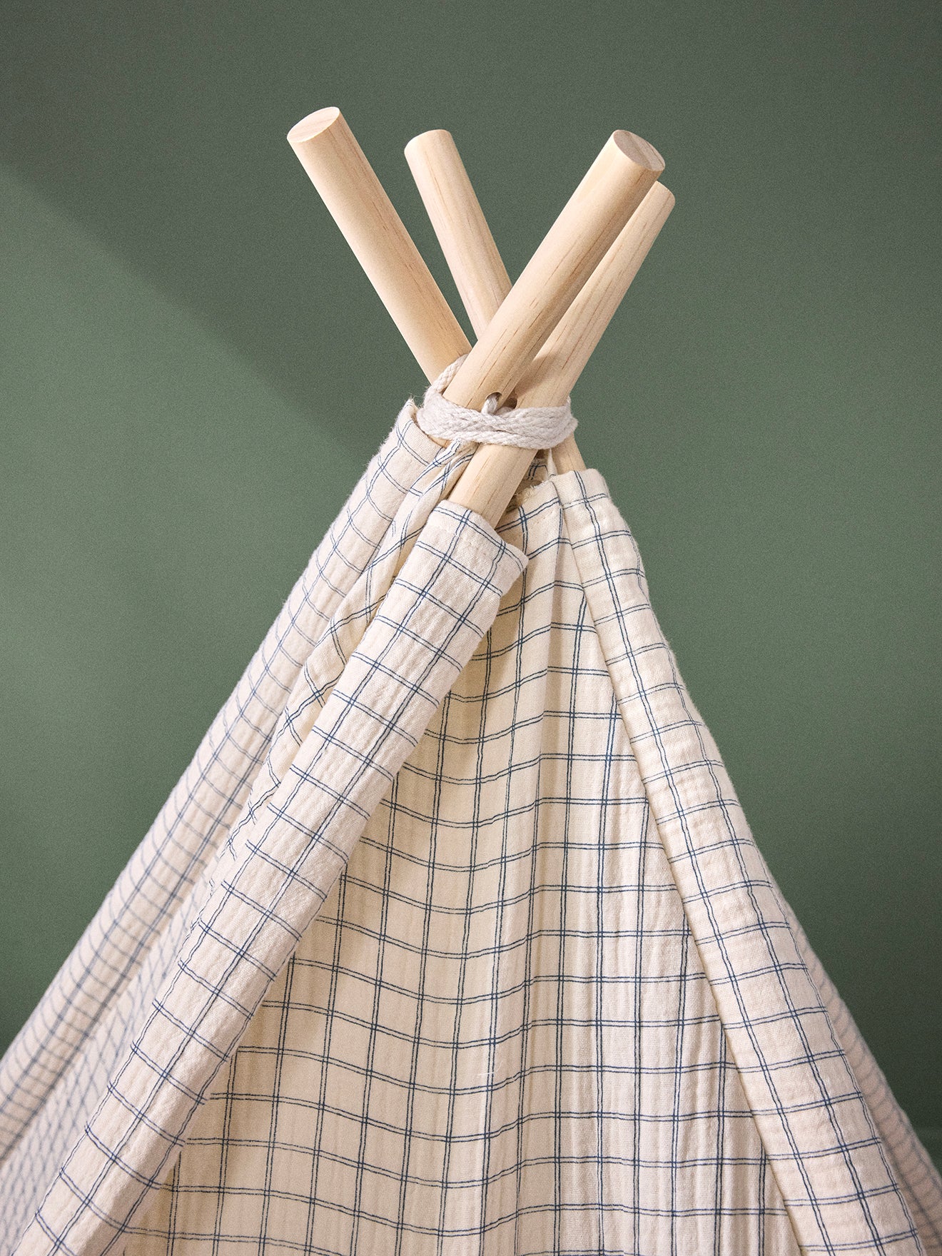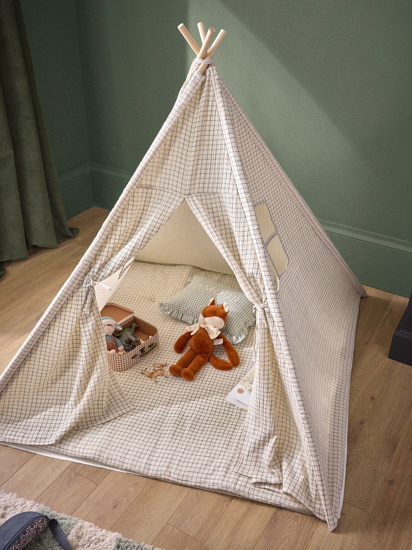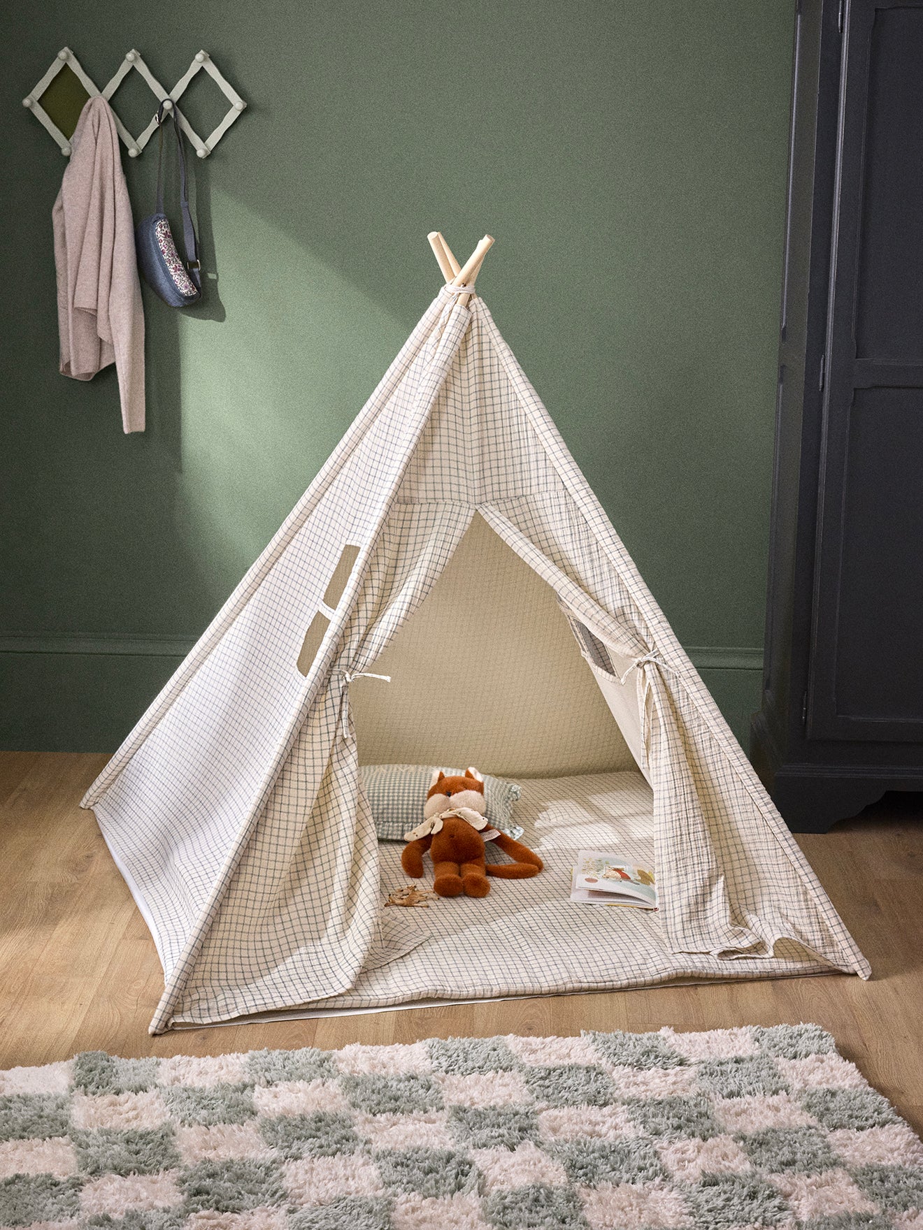Child's tent designed in a cottage style, made with 4 wooden stakes and a cotton gauze print fabric. A cozy little nest for playing or relaxing comfortably thanks to the included soft mattress.