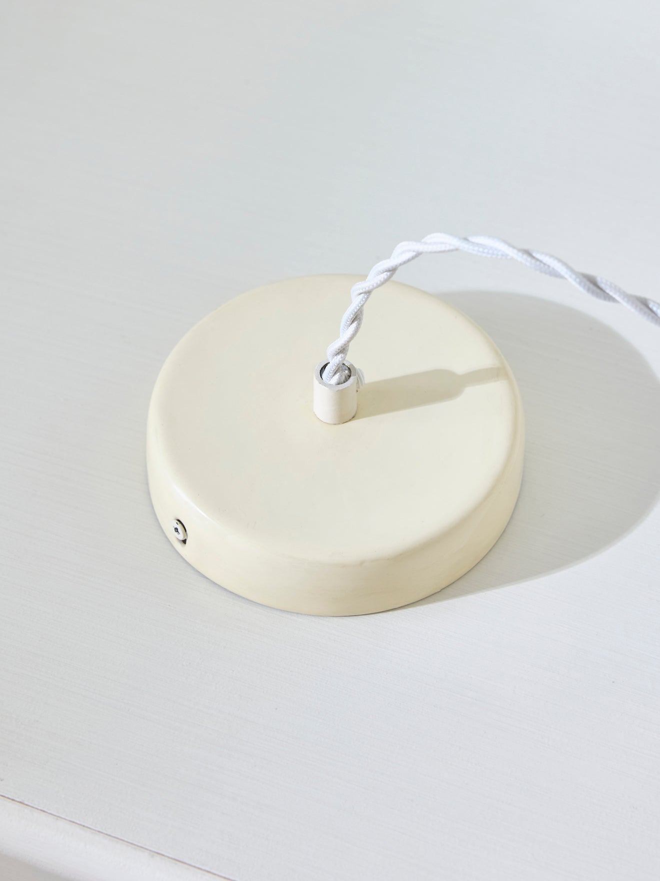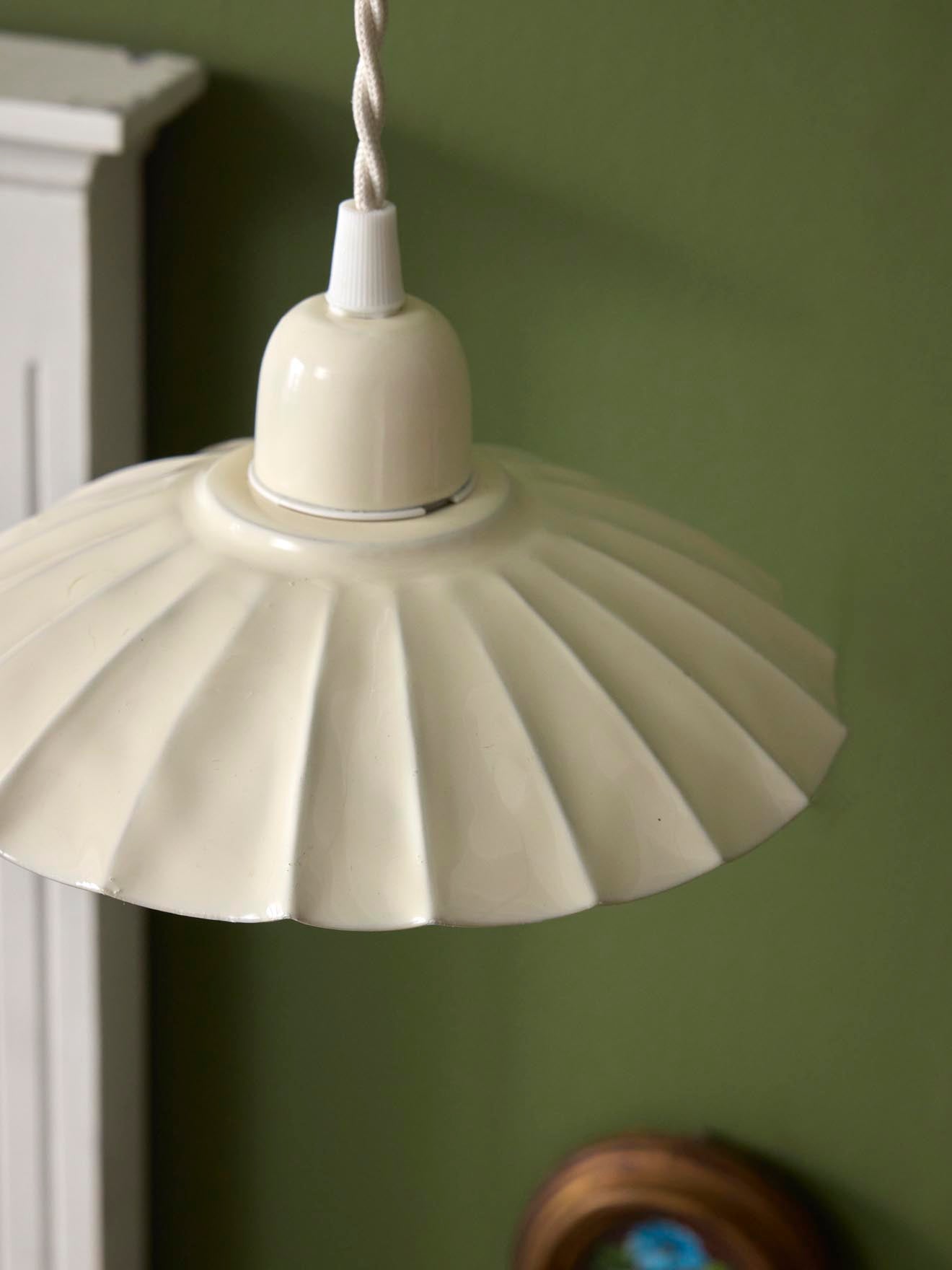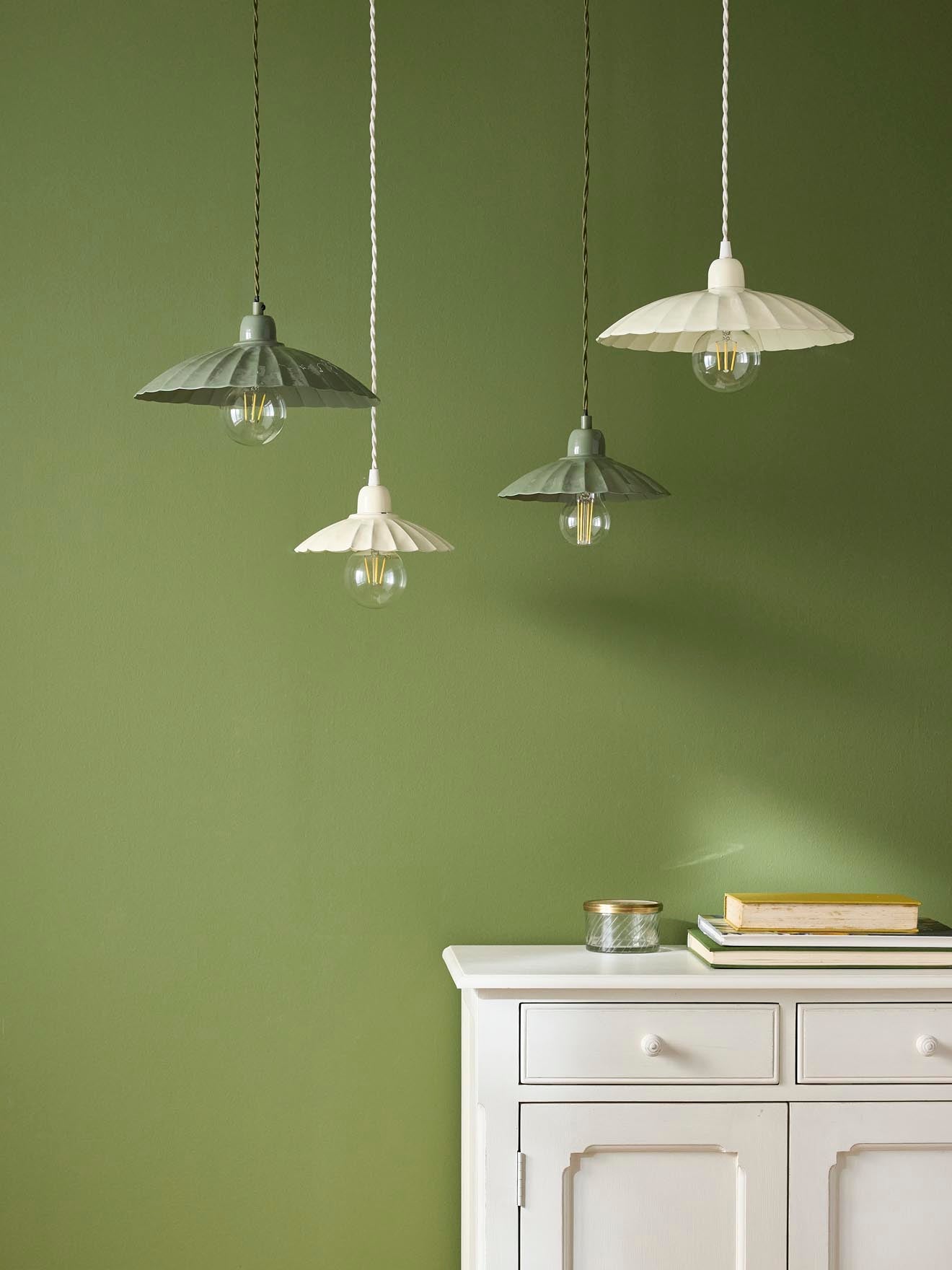 Tulip shaped hanging lamp in painted enameled metal. Classic style updated with a filament bulb that contrasts modern and authentic. The small size allows you to group several together and create a bouquet. Play with the cable length and hang either at the same height or off-kilter. The long cable makes it possible to use the Aline hanging lamp to light a nightstand.