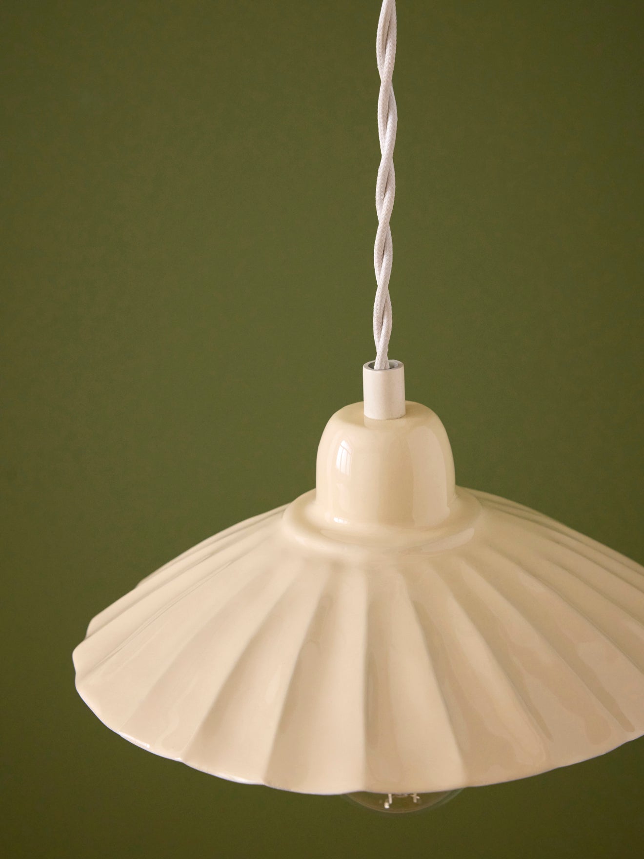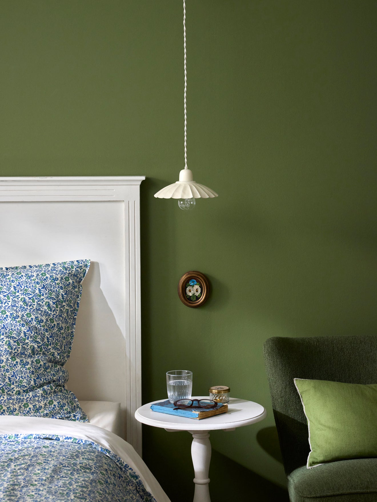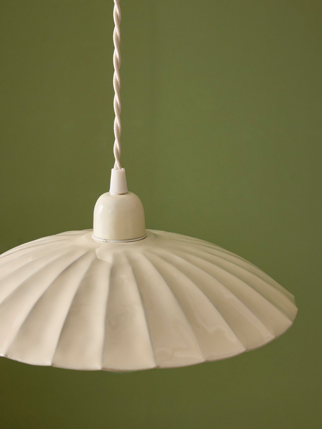 Tulip shaped hanging lamp in painted enameled metal. Classic style updated with a filament bulb that contrasts modern and authentic. The small size allows you to group several together and create a bouquet. Play with the cable length and hang either at the same height or off-kilter. The long cable makes it possible to use the Aline hanging lamp to light a nightstand.