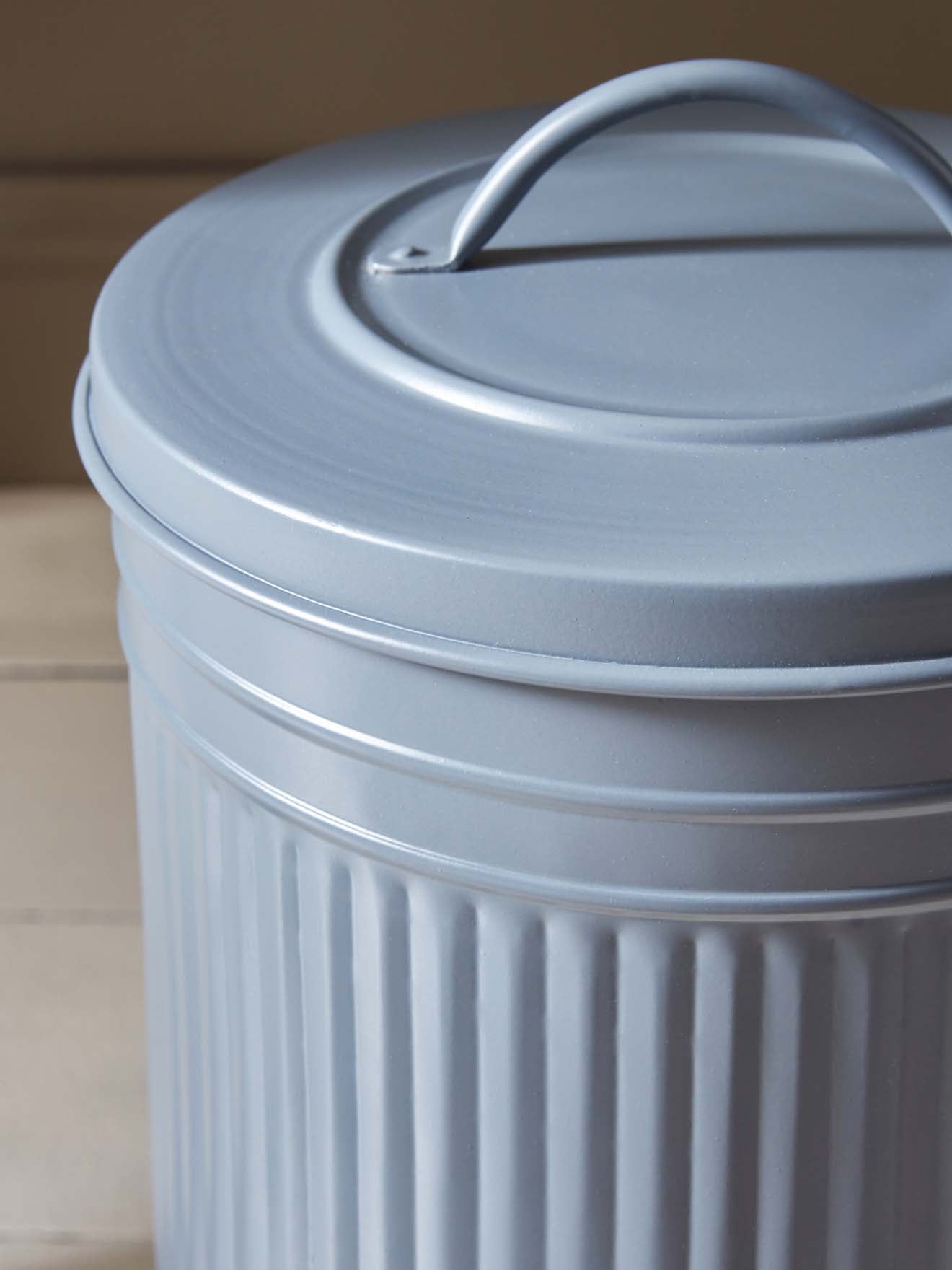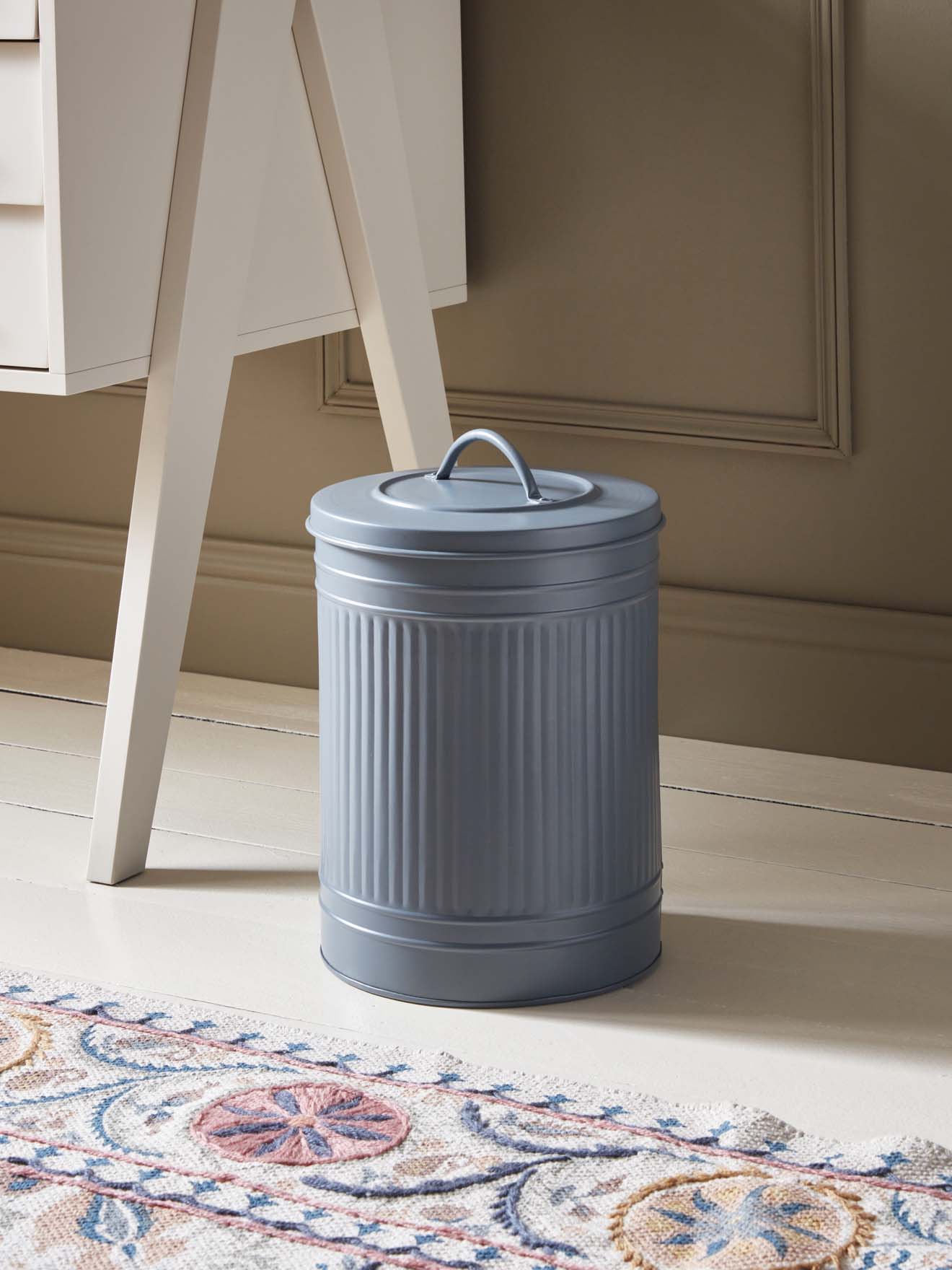 A painted metal waste basket made in India. It comes with a lid with a handle and is perfect next to a desk or in the bathroom.