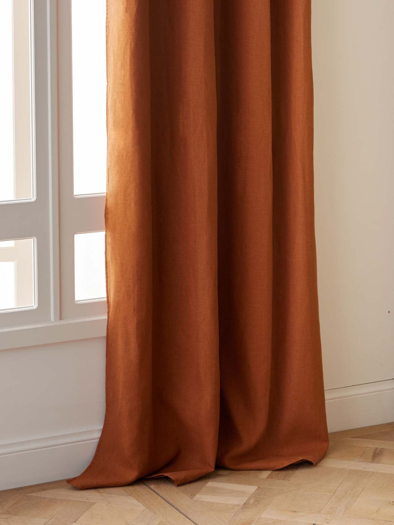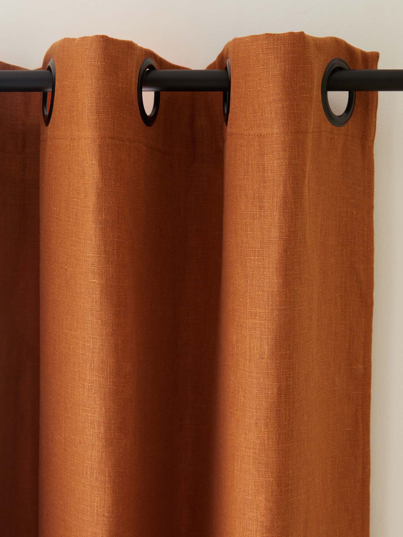 A thick linen curtain with meticulous finish. The tone-on-tone lining discreetly blocks the light. This blackout curtain is available in a range of delicate and trendy colors with black eyelets that add a modern note.