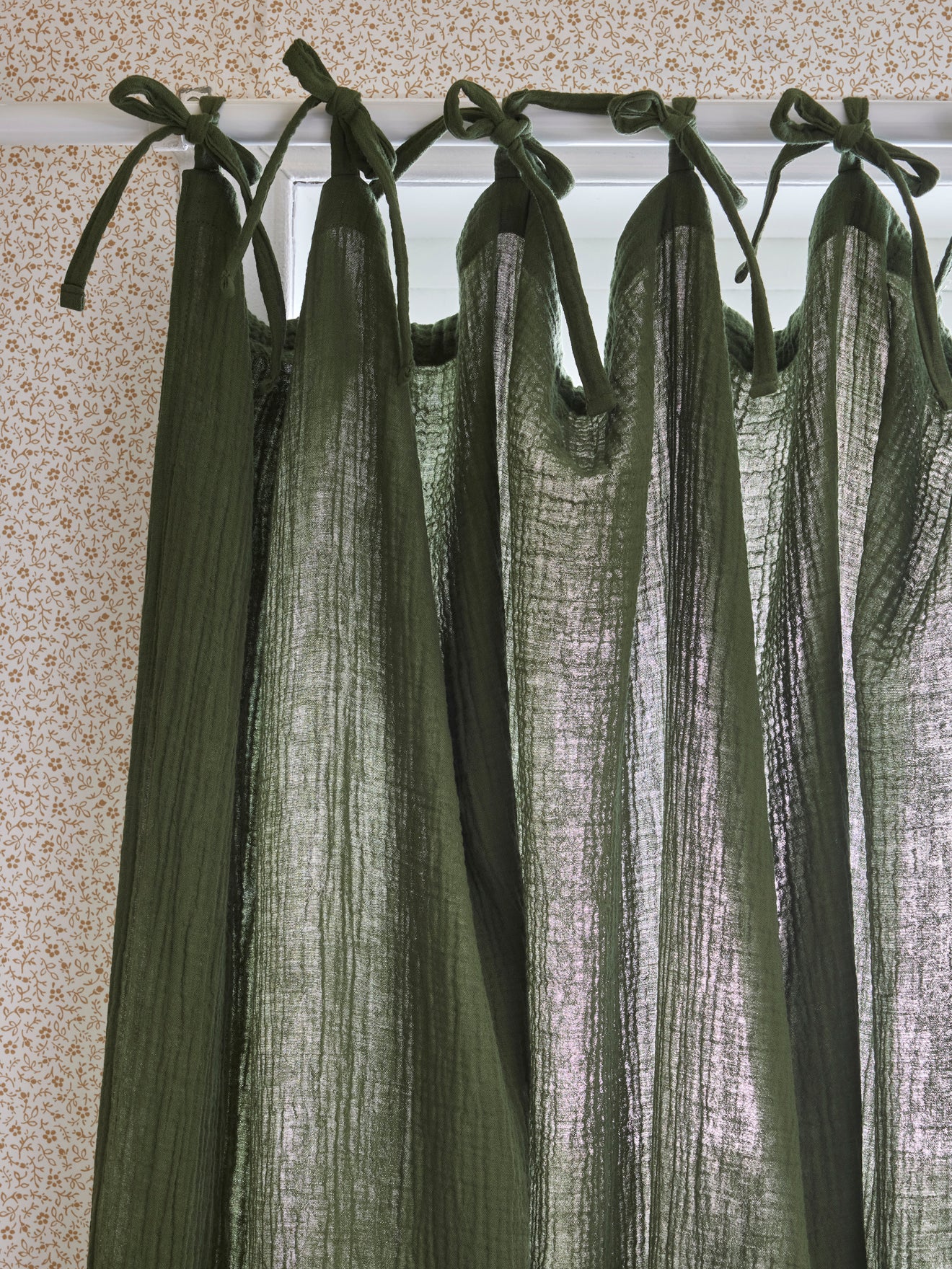 Curtain made with cotton gauze and held with small ties. A crinkled curtain with deliccate refinement.