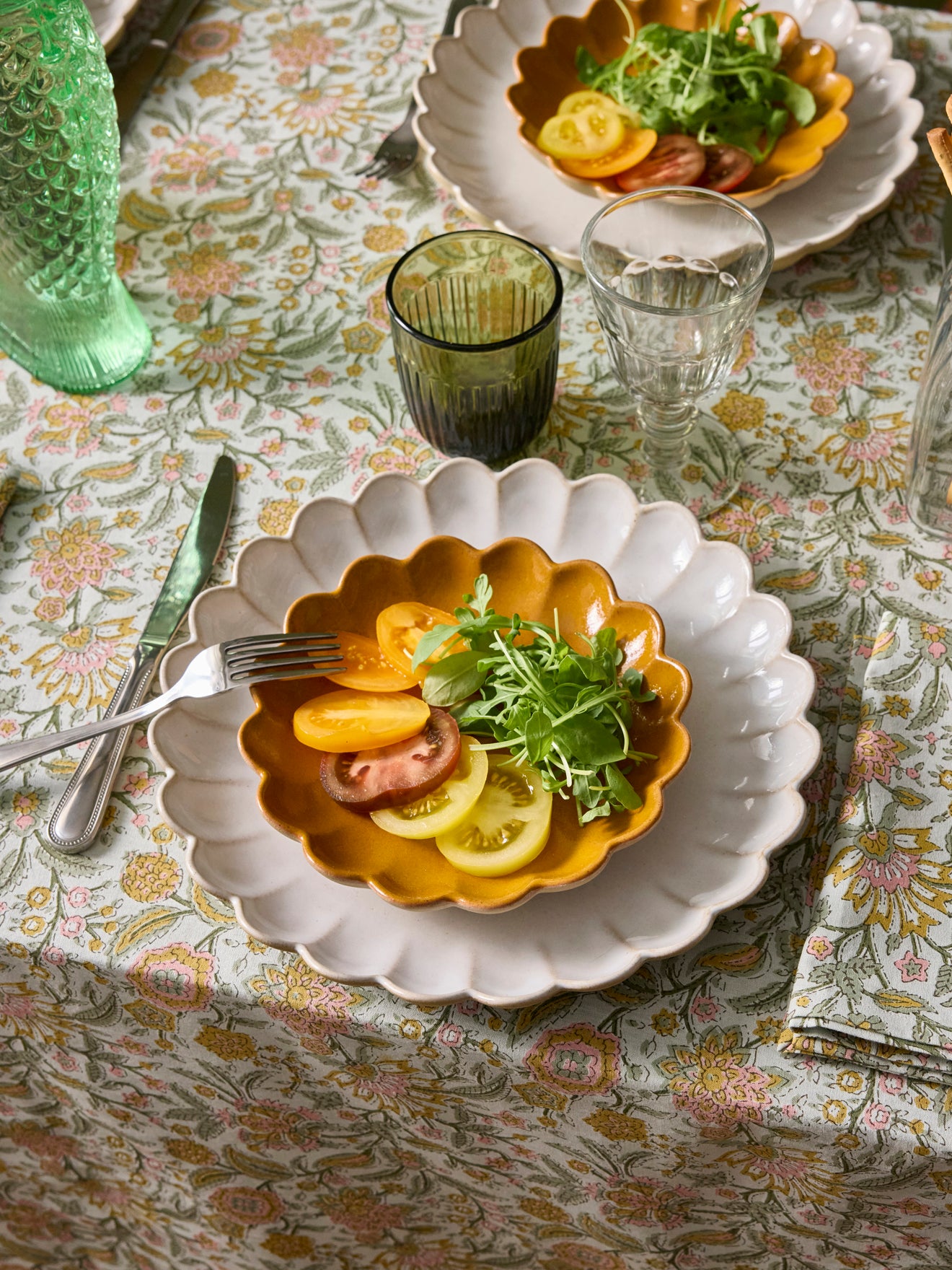 The Marrakesh range is produced by the stoneware brand Costa Nova. Originally from the charming village of the same name located on the Portuguese coast, Costa Nova is known for the quality and durability of its products. The Marrakesh range was designed by the French floral artist Christian Tortu. It combines sustainable artisanal production with the essence of nature and Moroccan mystique. The Marrakesh dessert or starter plate has a distinctive flower shape.