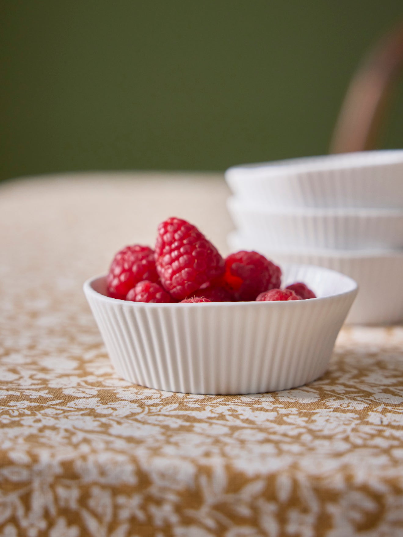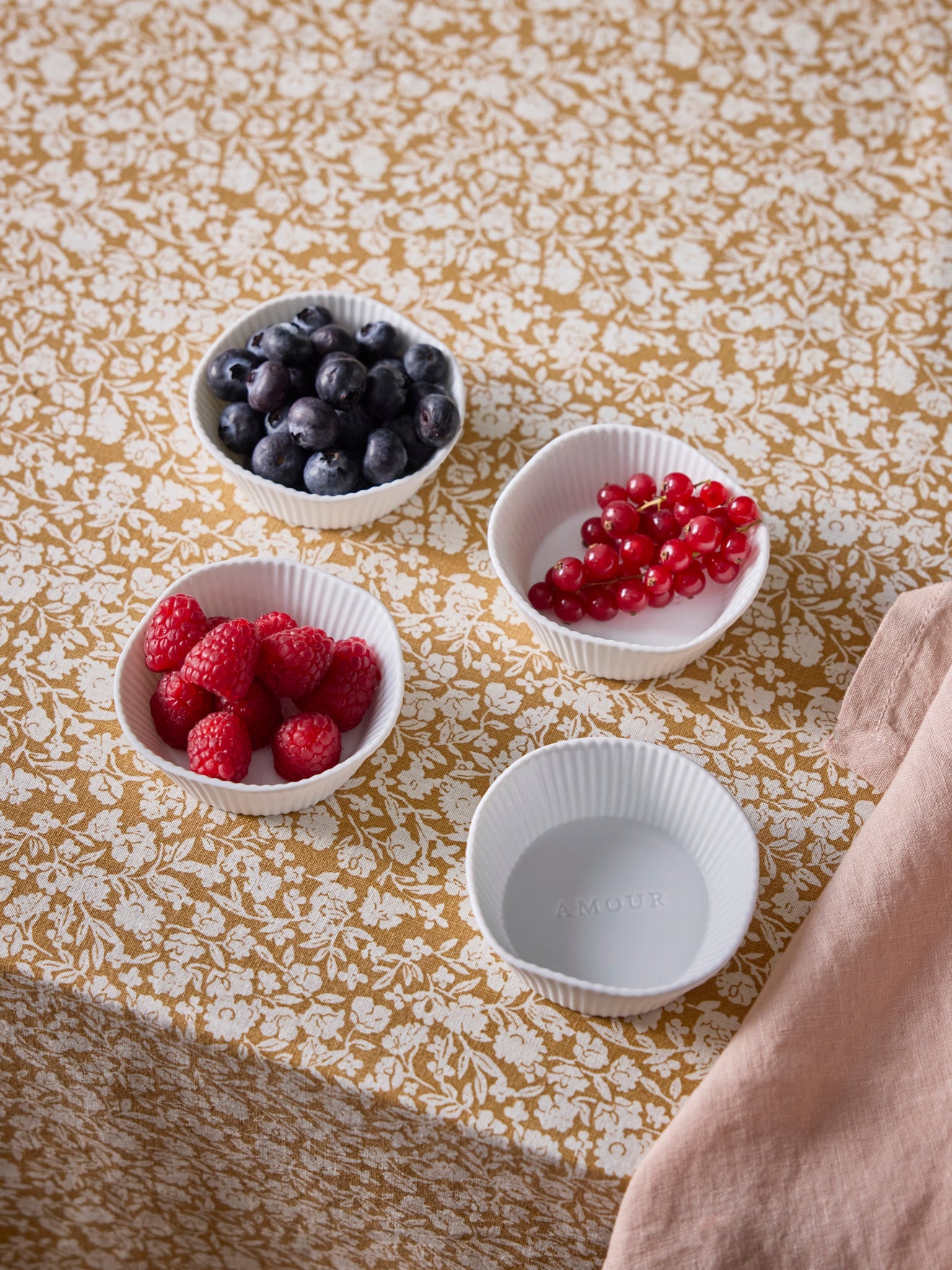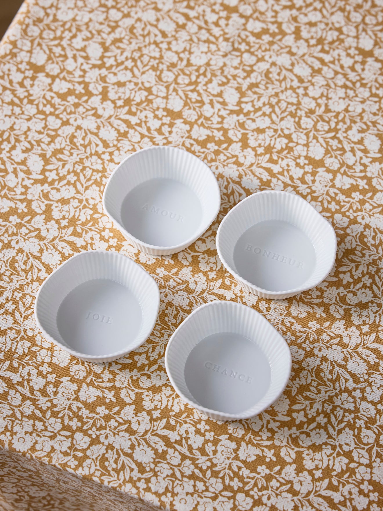 Set of 4 small bowls in ceramic biscuit. Biscuit is unglazed porcelain which gives it a matte aspect. The inside is glazed to protect the ceramic from discoloration. Grooved, irregularly rounded dishes with a message on the bottom: Amour, Bonheur, Joie and Chance*. Ideal for aperitifs, desserts or tea-time.