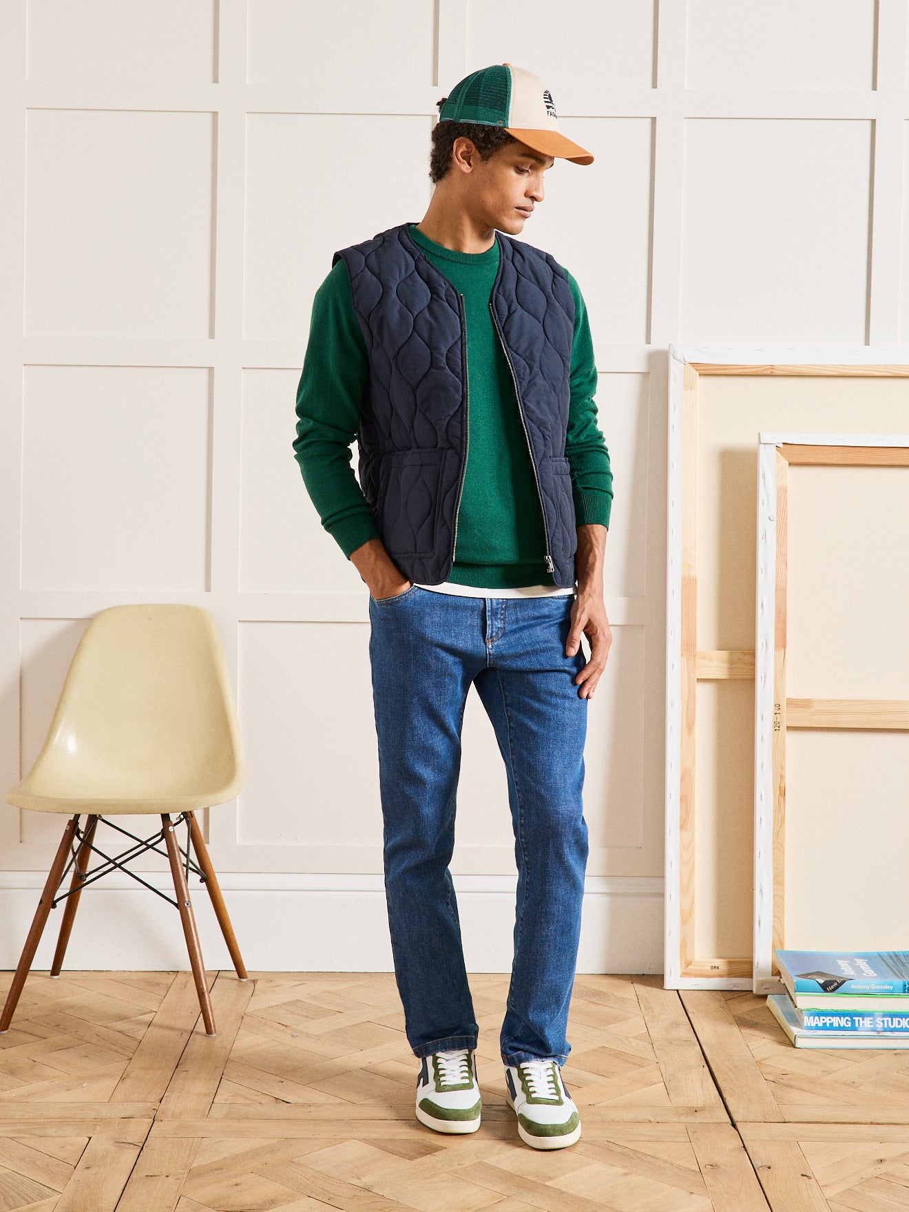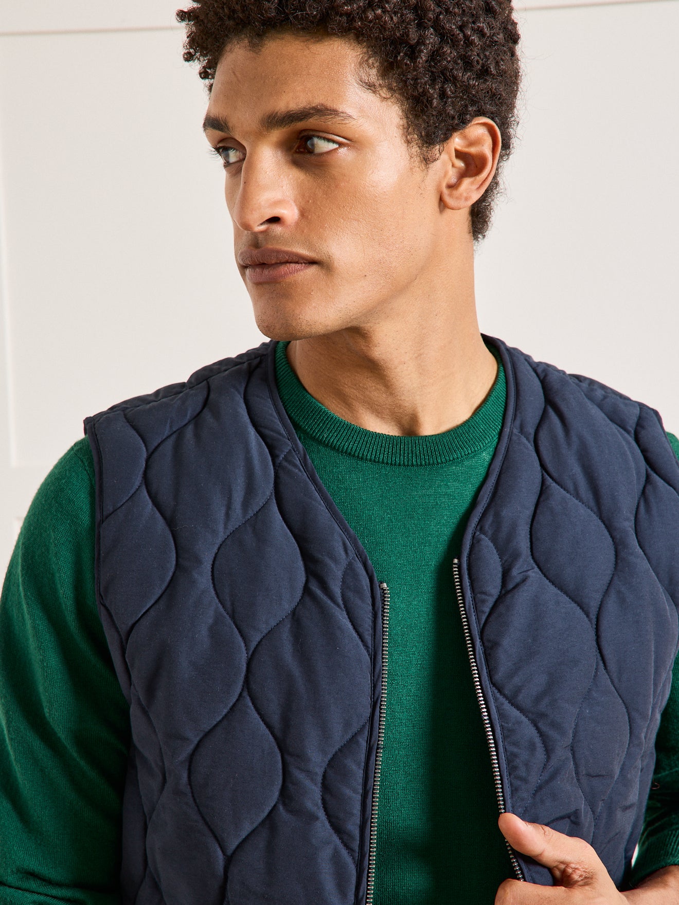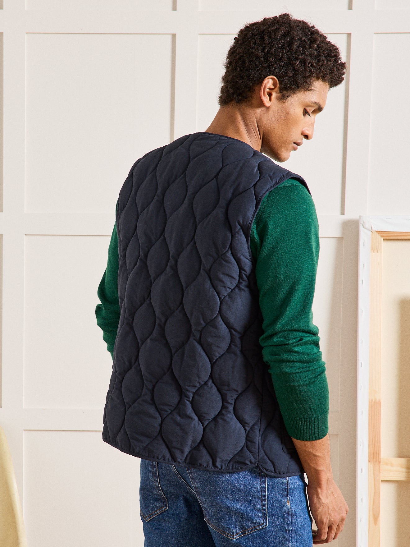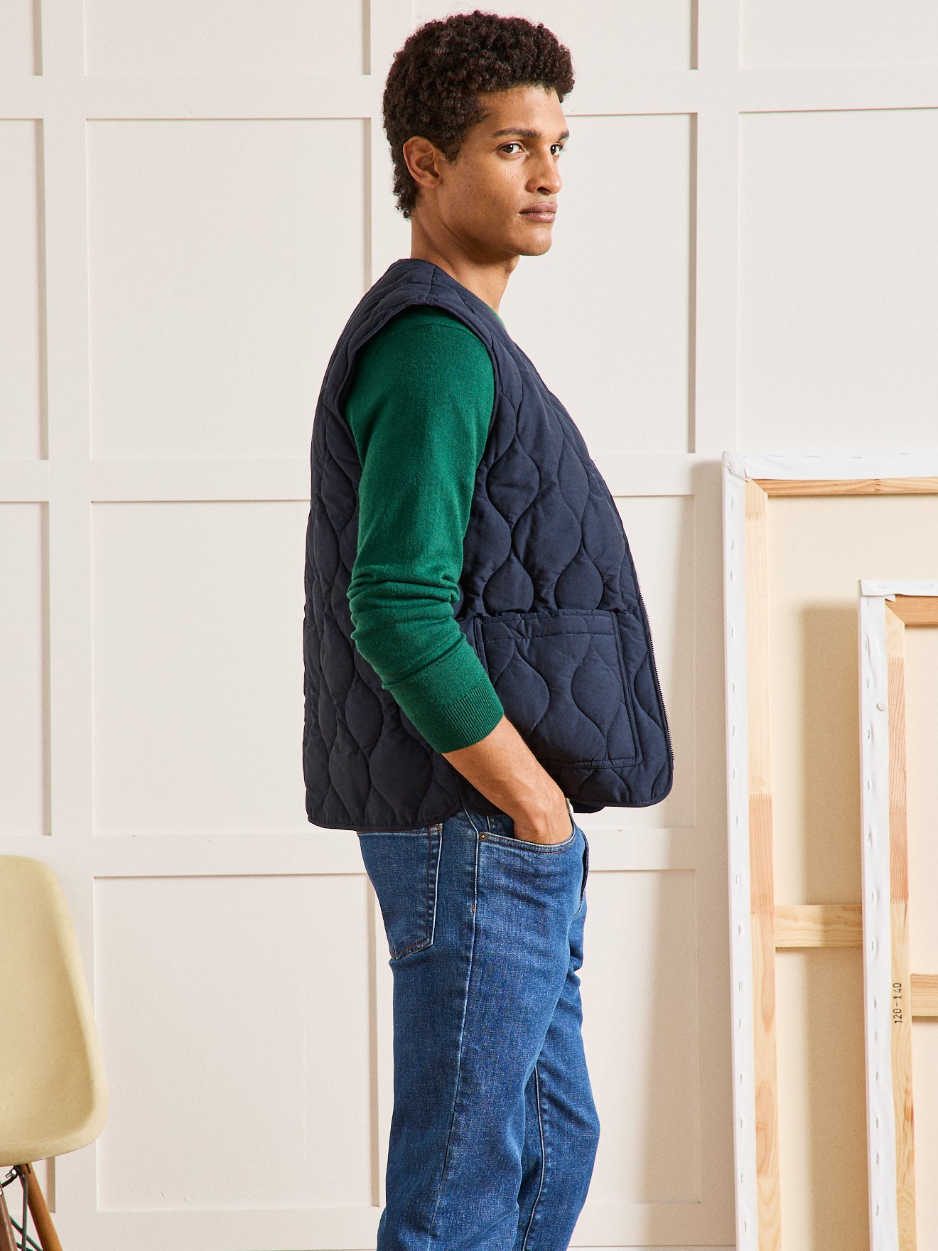 Wear this jacket over a sweater or with jeans or chinos, even below a jacket. Timeless and easy-wear for every day, this quilted sleeveless jacket can be layered for modern looks that finish a silhouette for warm style. Updated with a modern modern matte fabric, this jacket also has a decorative quilting for unique style.