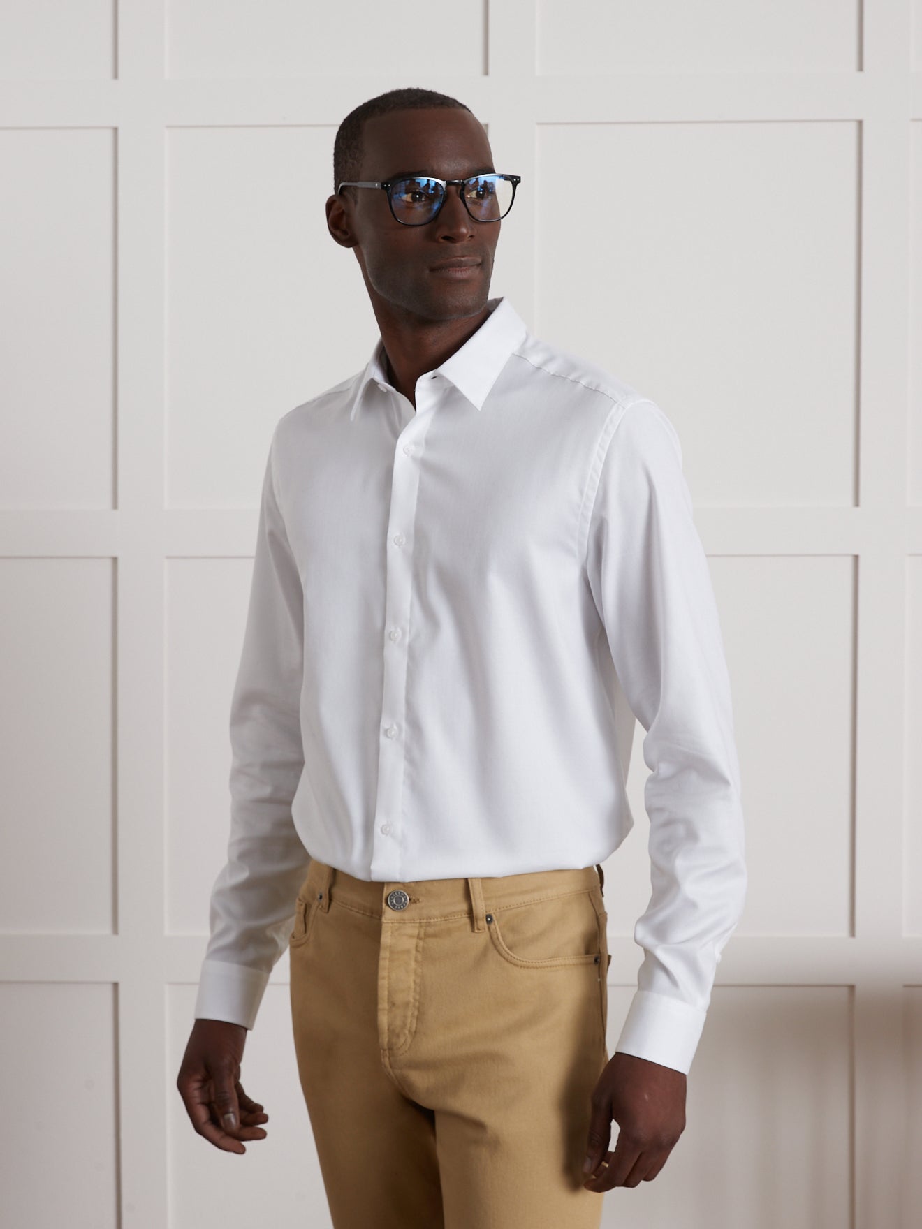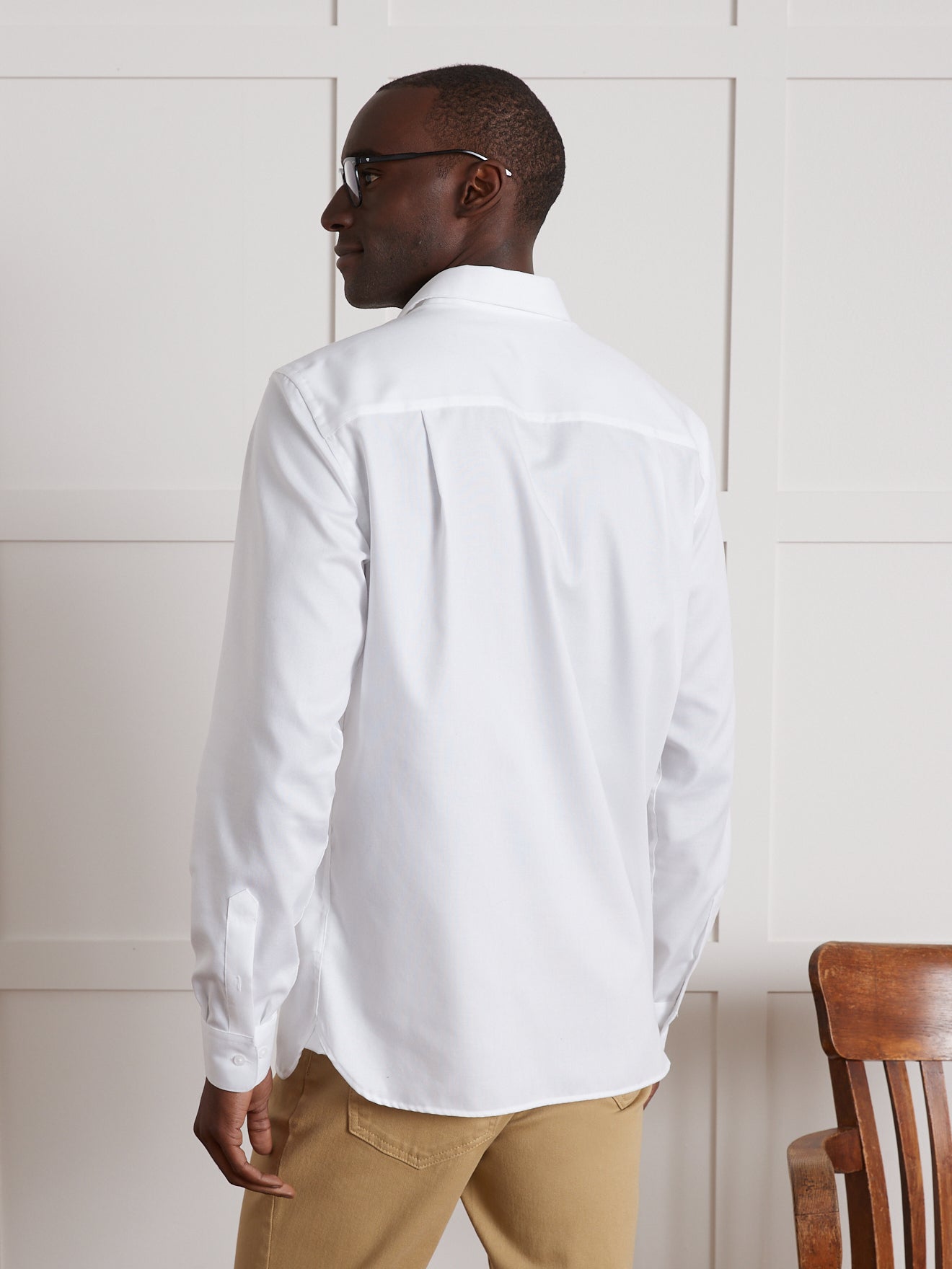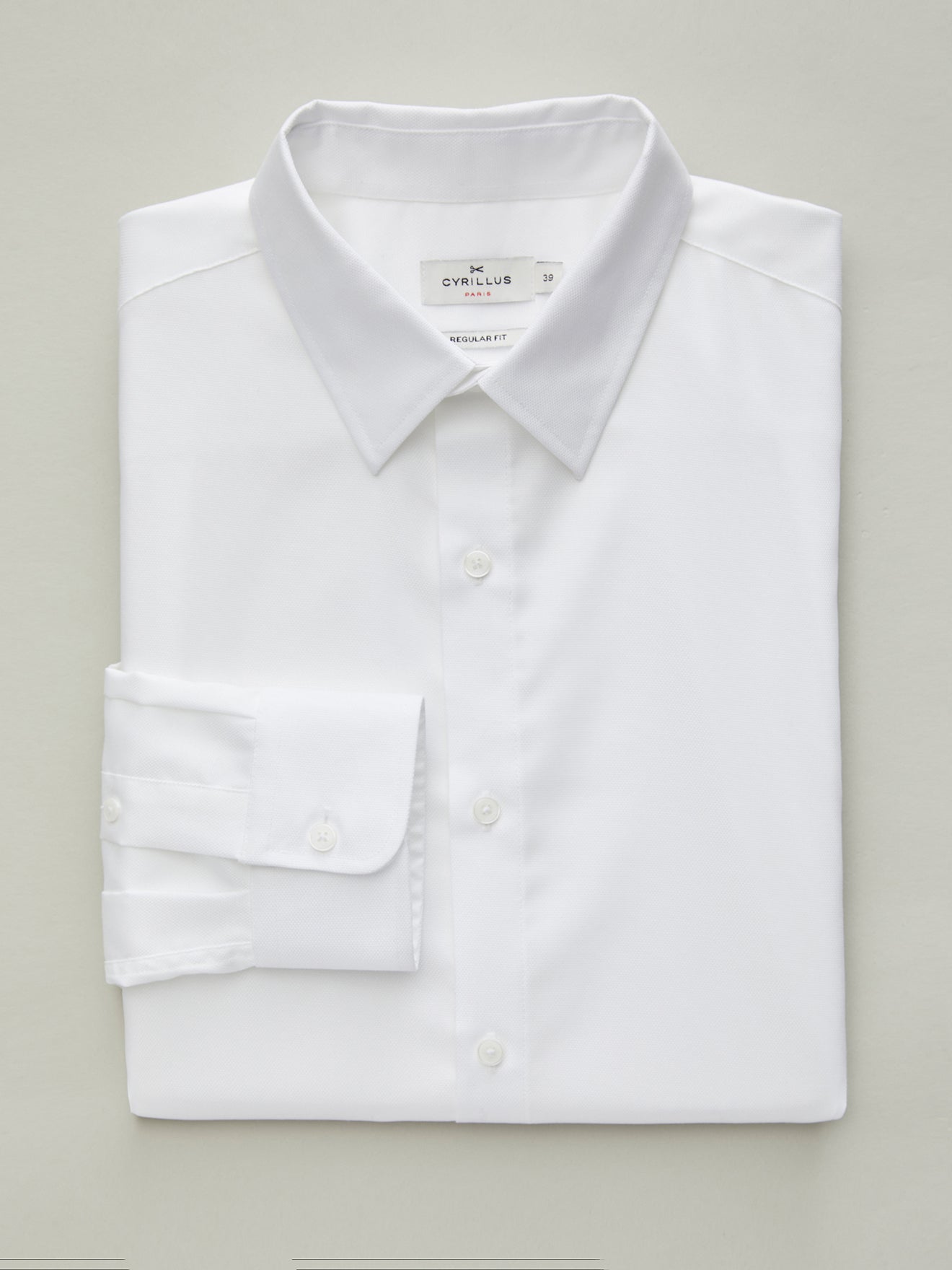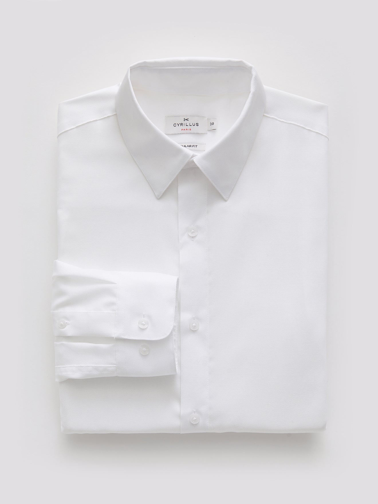 Blanc intemporel pour la chemise au chic urbain évident. Son coton pinpoint, léger et agréable à porter même quand il fait chaud, assure un confort et une tenue exemplaires. Coupe droite convenant à toutes les morphologies avec col classique, patte de boutonnage et poignets arrondis.