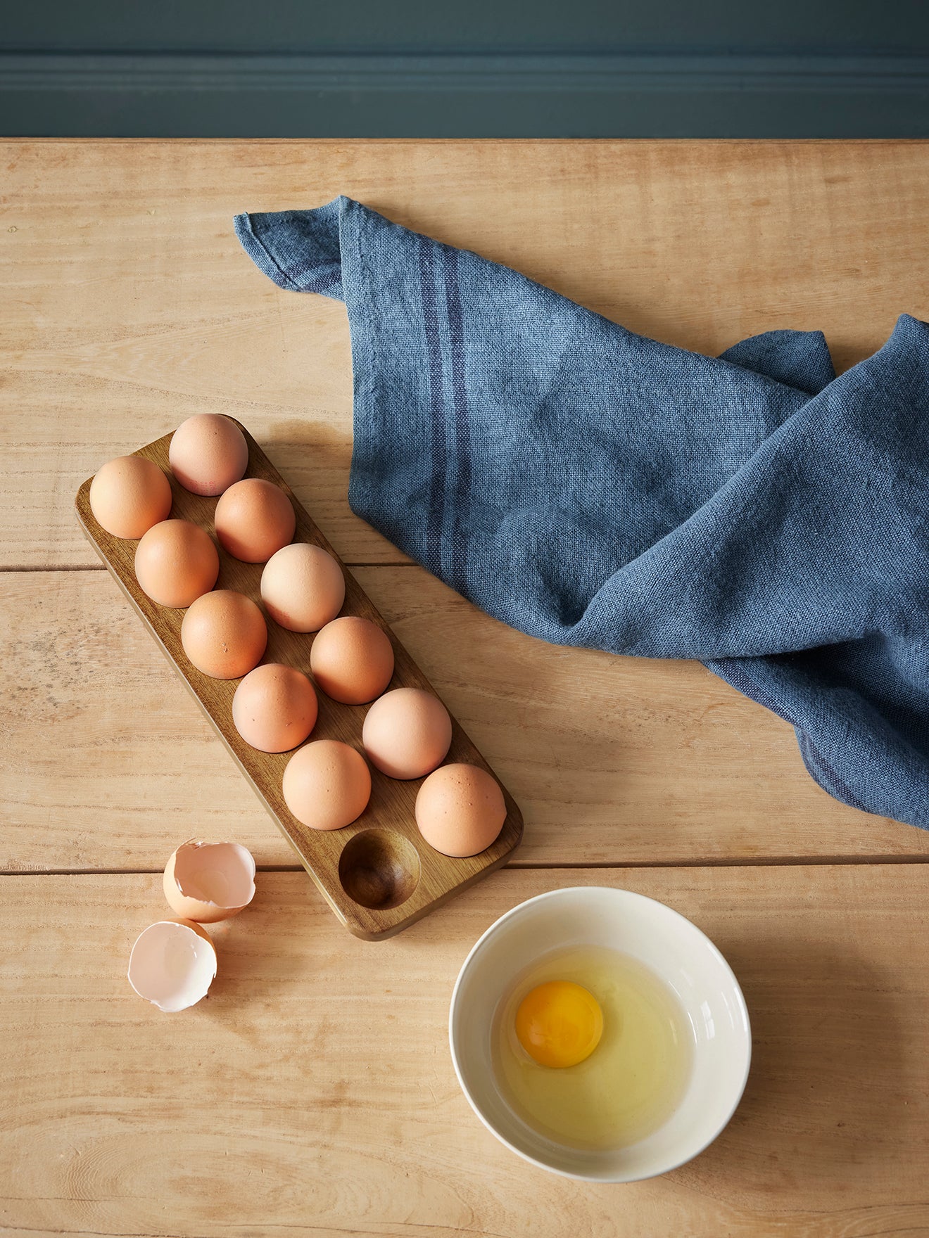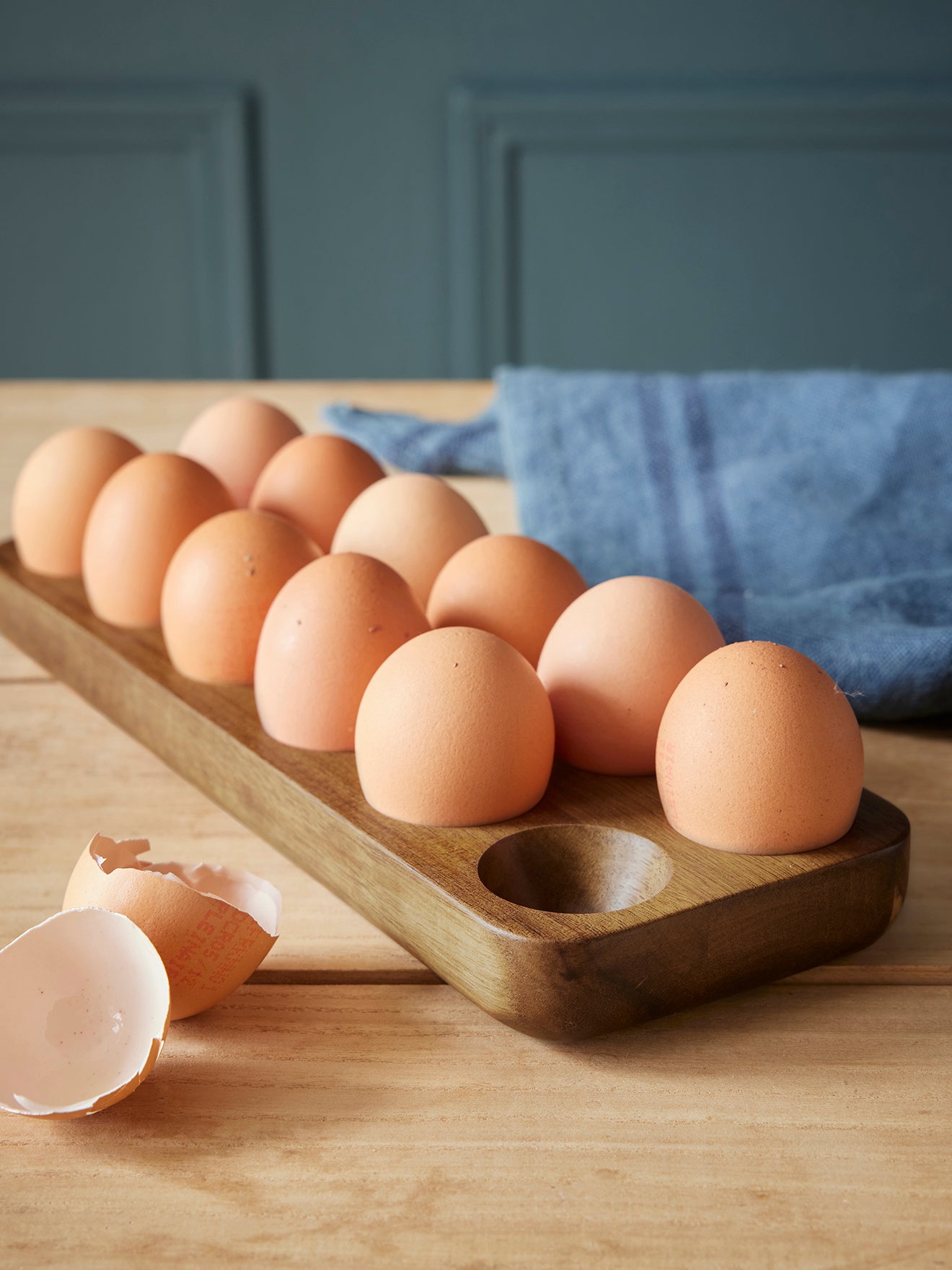 Nous avons conçu ce support à oeufs en bois d'acacia massif afin de ranger les oeufs de manière chic et esthétique dans la cuisine. Il peut contenir 12 oeufs. Bon à savoir : les oeufs frais peuvent se conserver hors du réfrigérateur. Sauf s'ils sont durs !