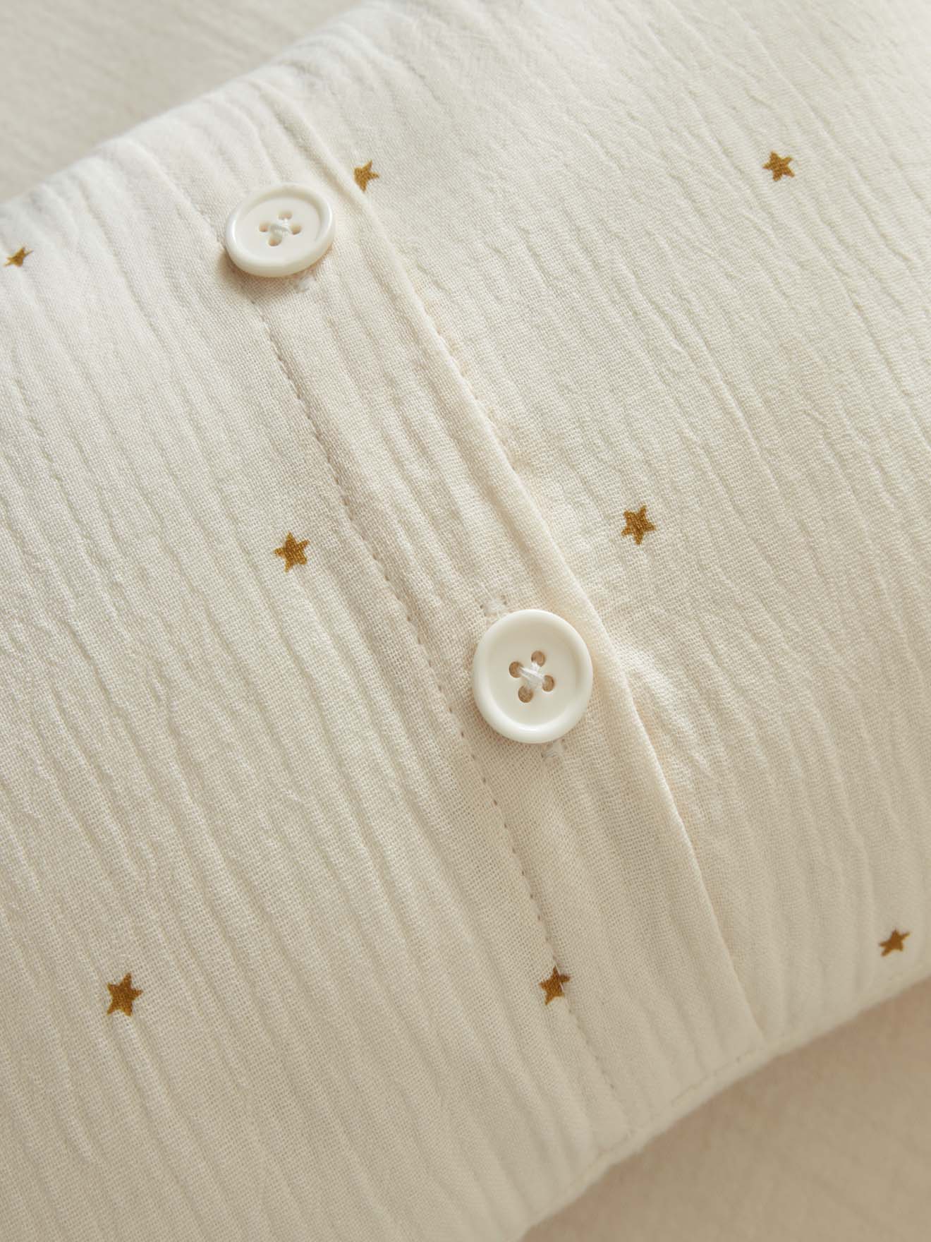 Imprimés exclusifs et broderie "doux rêves" en fil doré. La tendresse se pose sur ce coussin déhoussable aussi mini que mignon.