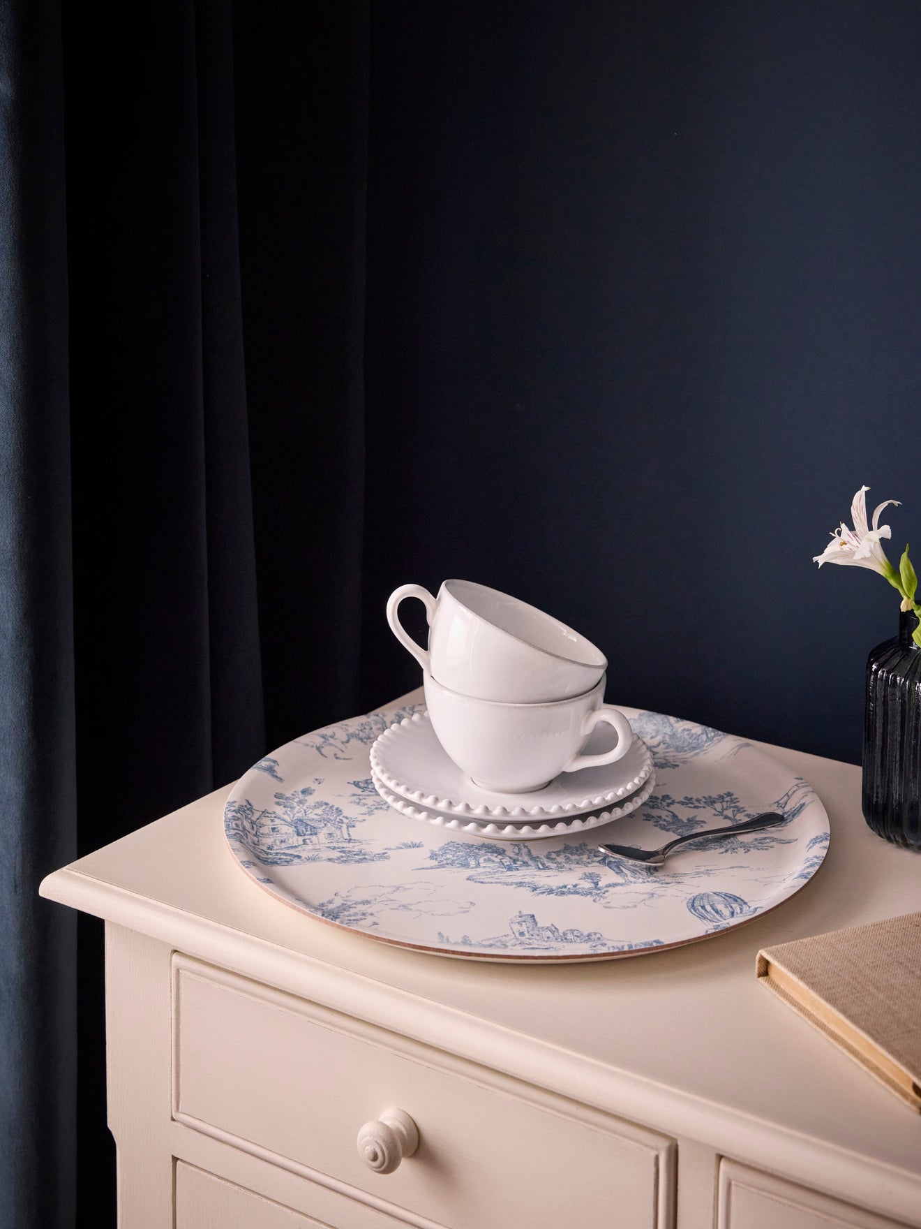Le petit plateau Esprit Jouy s'inspire de la célèbre toile. Un imprimé exclusif, dessiné par nos stylistes. Plateau fabriqué en Europe, en bois de hêtre massif puis tapissé de papier imprimé et recouvert d'une fine pellicule de protection mate et incolore.