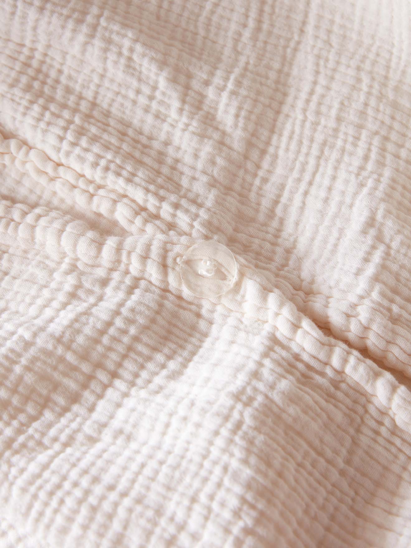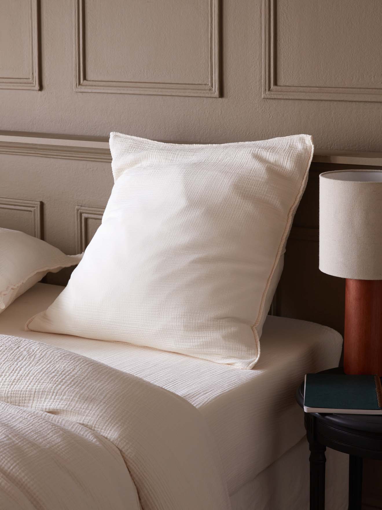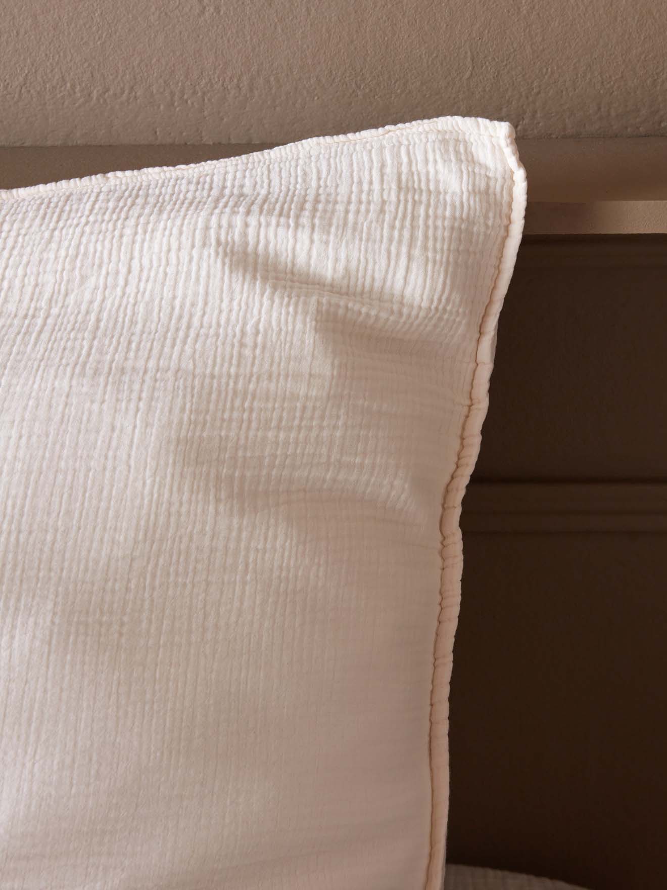 Taie d'oreiller en gaze de coton tissée et confectionnée au Portugal. Son aspect légèrement gaufré procure une sensation de confort doux et aérien.