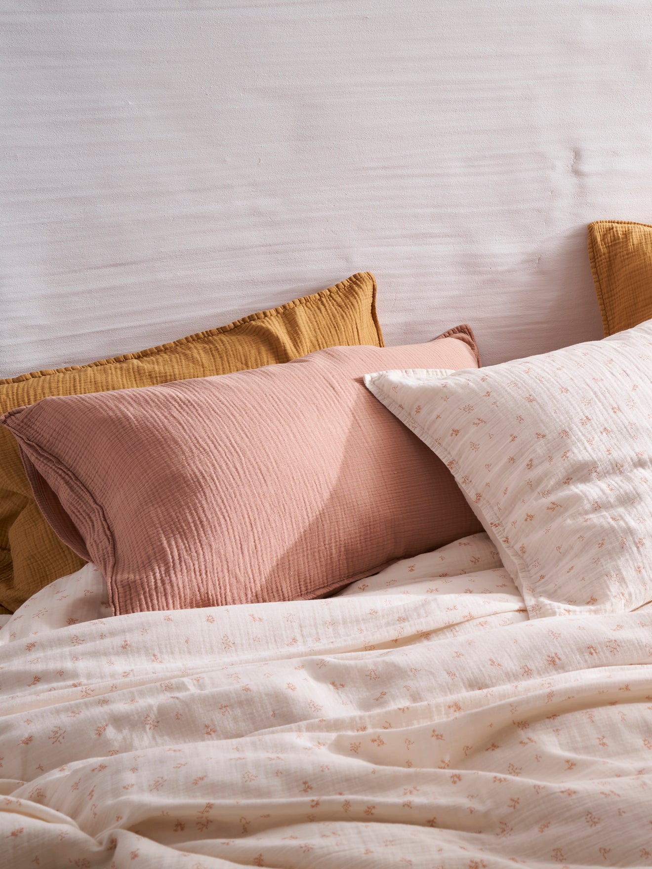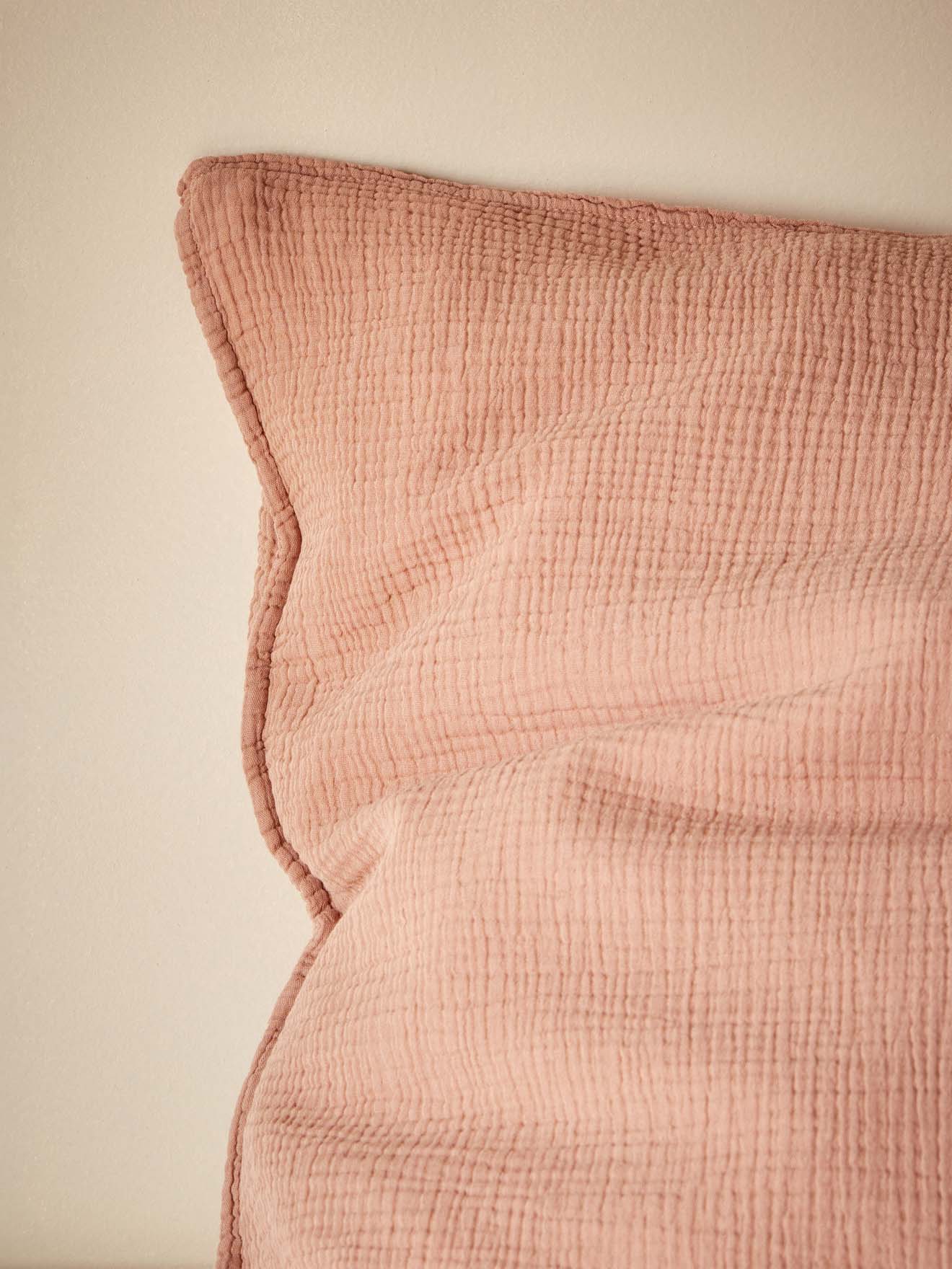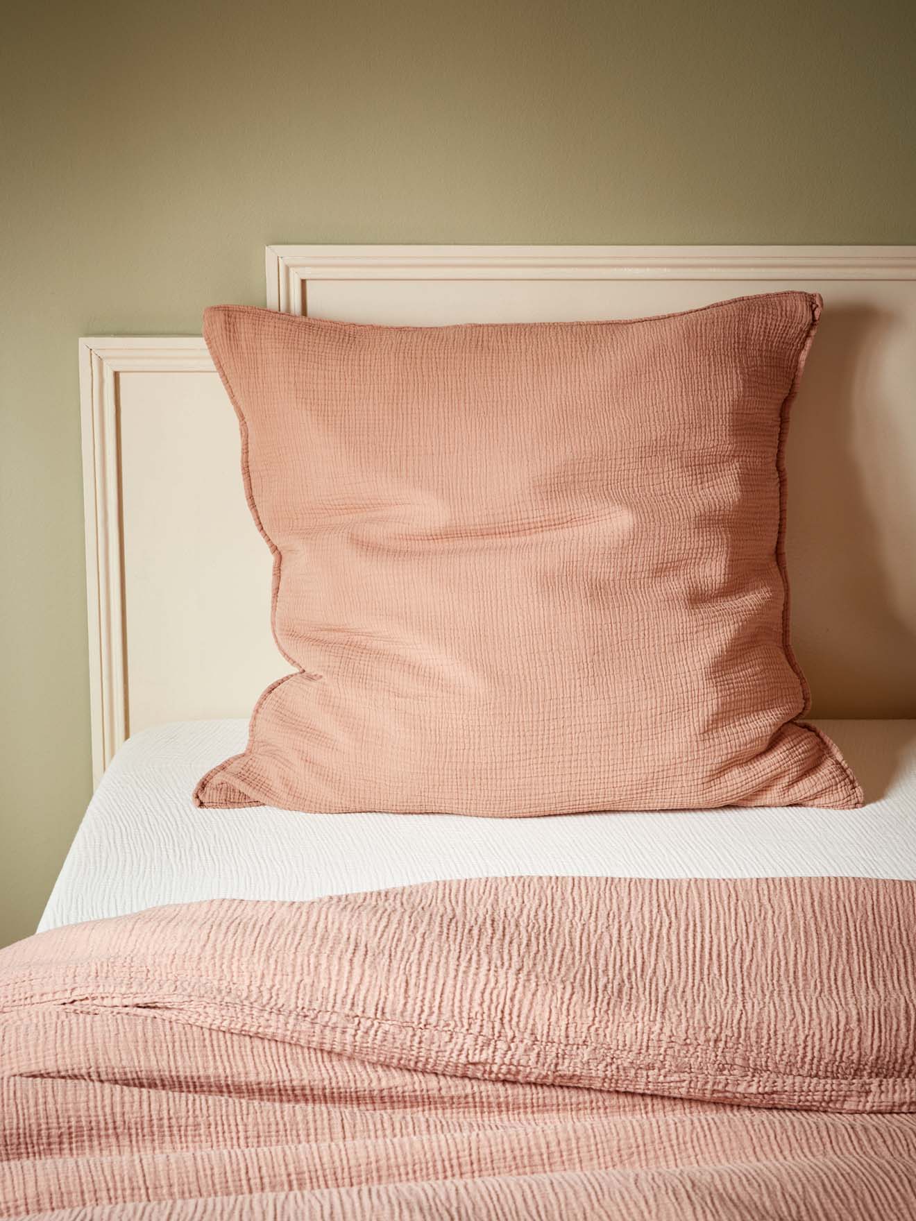 Taie d'oreiller en gaze de coton tissée et confectionnée au Portugal. Son aspect légèrement gaufré procure une sensation de confort doux et aérien.