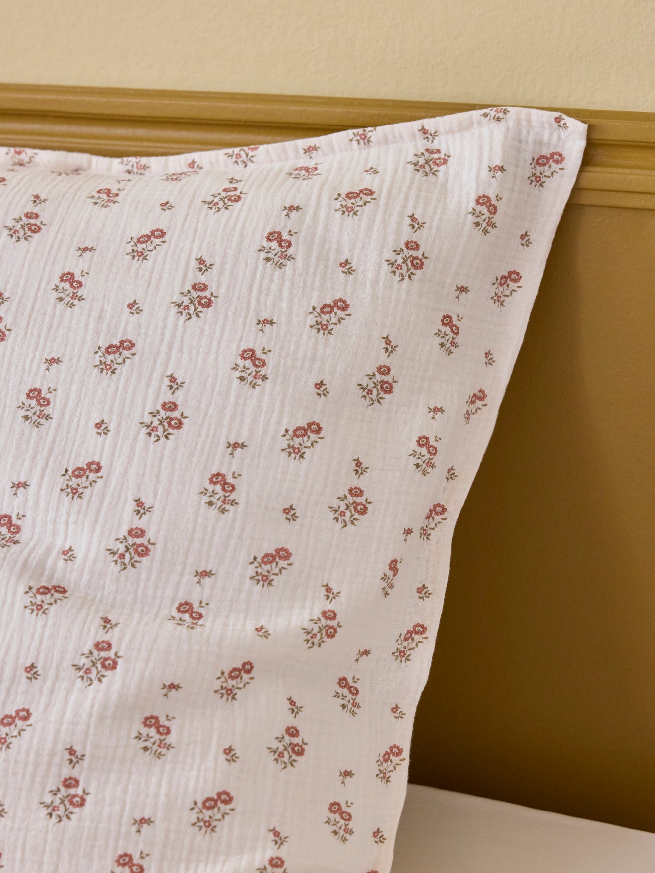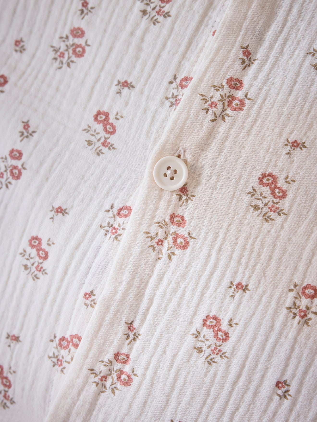 Petits bouquets de fleurs imprimés sur une gaze légèrement rosée, douce et aérienne. Taie d'oreiller imprimée recto/ verso, bordée d'un petit volant plat et fermée au dos par des boutons.