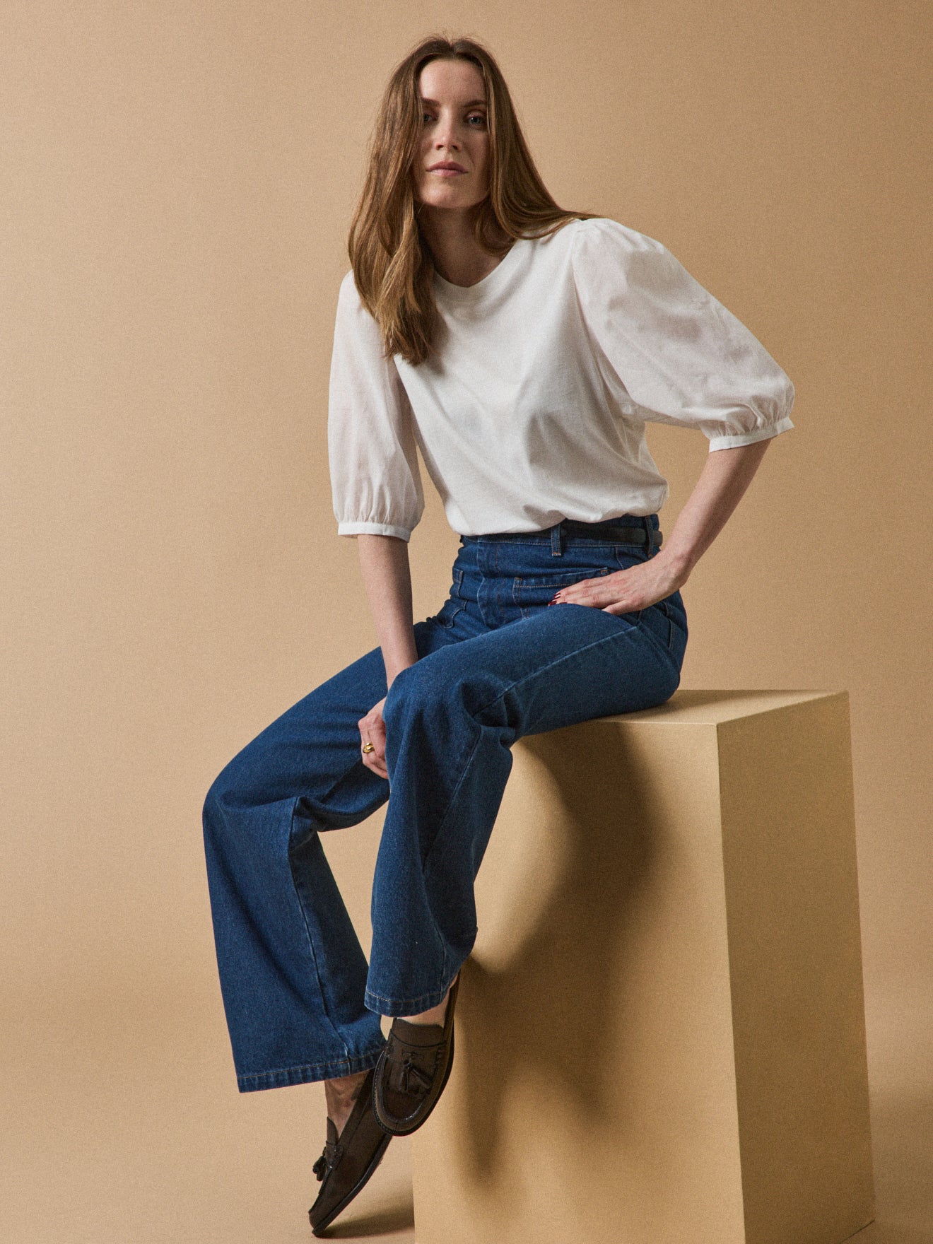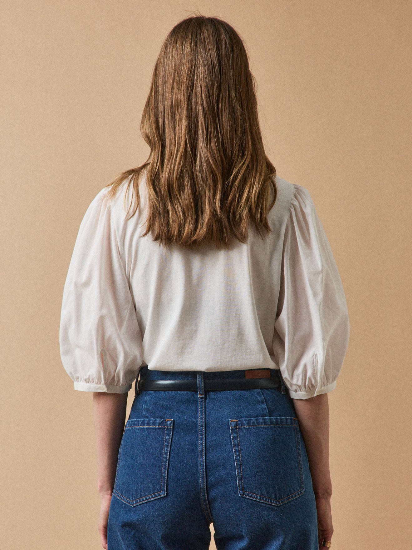 Avec ses manches courtes ballon en voile de coton, le T-shirt se prête à un vestiaire quotidien subtil et féminin. Confection Portugal.